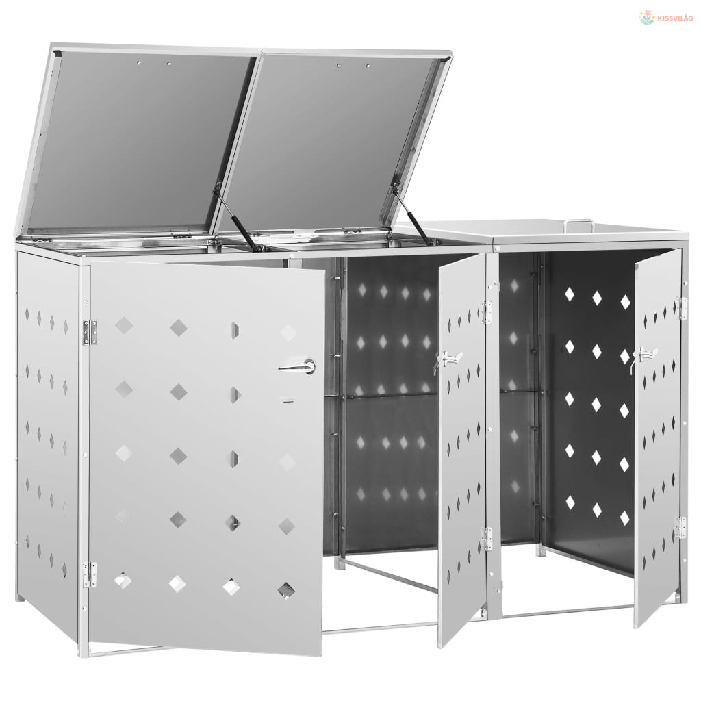 A rozsdamentes acélból készült kukatároló rendkívül időjárásálló és tartós. A hasznos szellőzőnyílások lehetővé teszik a szellőzést, és megakadályozzák a kellemetlen szagok elterjedését a tárolóban, a zár pedig biztosítja a szemetes biztonságos tárolását. Emellett a praktikus ajtó lehetővé teszi, hogy a szemeteskukát könnyen betegye és kivegye.