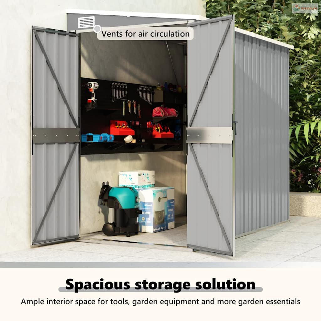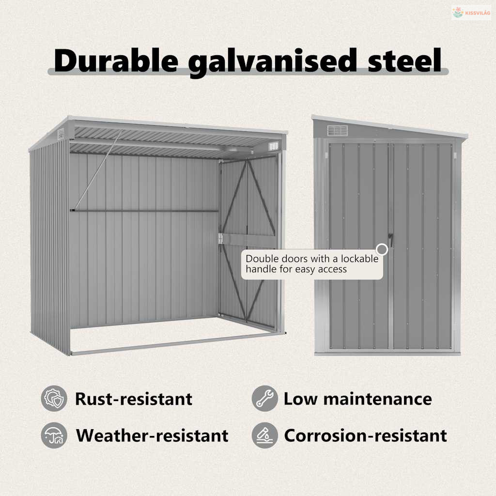 Mivel horganyzott acélból és fémből készült, a tároló minimális karbantartást igényel és nagyon tartós. Az elülső dupla nyíló ajtók könnyű be- és kijutást tesznek lehetővé. A zárható műanyag fogantyú biztosítja a tárgy biztonságát. Ezenkívül az esővíz automatikusan elfolyik a tetőről a lejtős kialakításnak köszönhetően.
