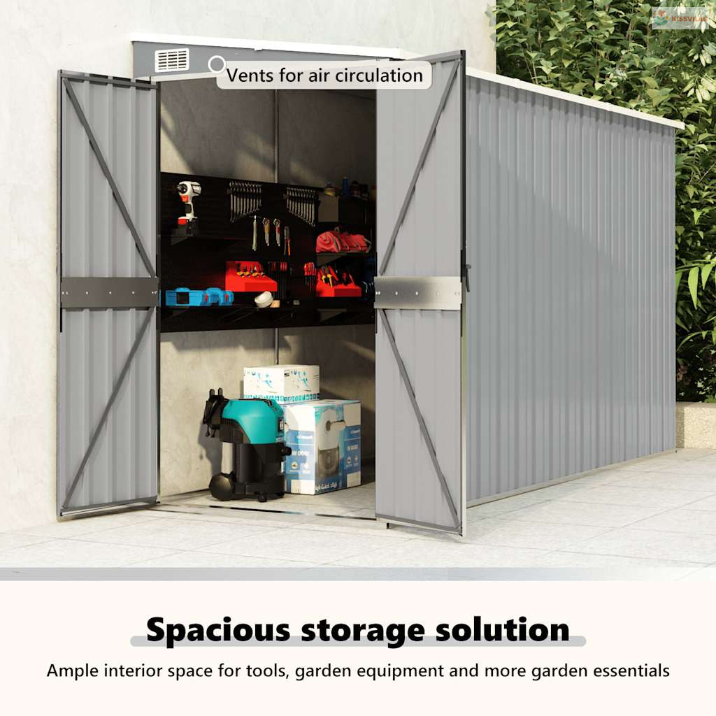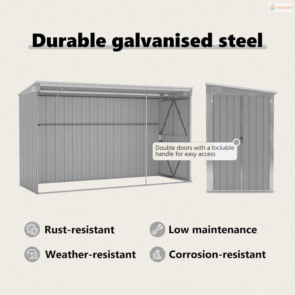 Ez a tárolófészer horganyzott acélból és fémből készült, így rendkívül tartós, valamint minimális karbantartást igényel. Az elején található kétfelé nyíló ajtók könnyű be- és kilépést biztosítanak. A zárható műanyag fogantyú gondoskodik kellékei biztonságáról. A lejtős tervezésnek köszönhetően az eső automatikusan lefolyik a fészer tetejéről.