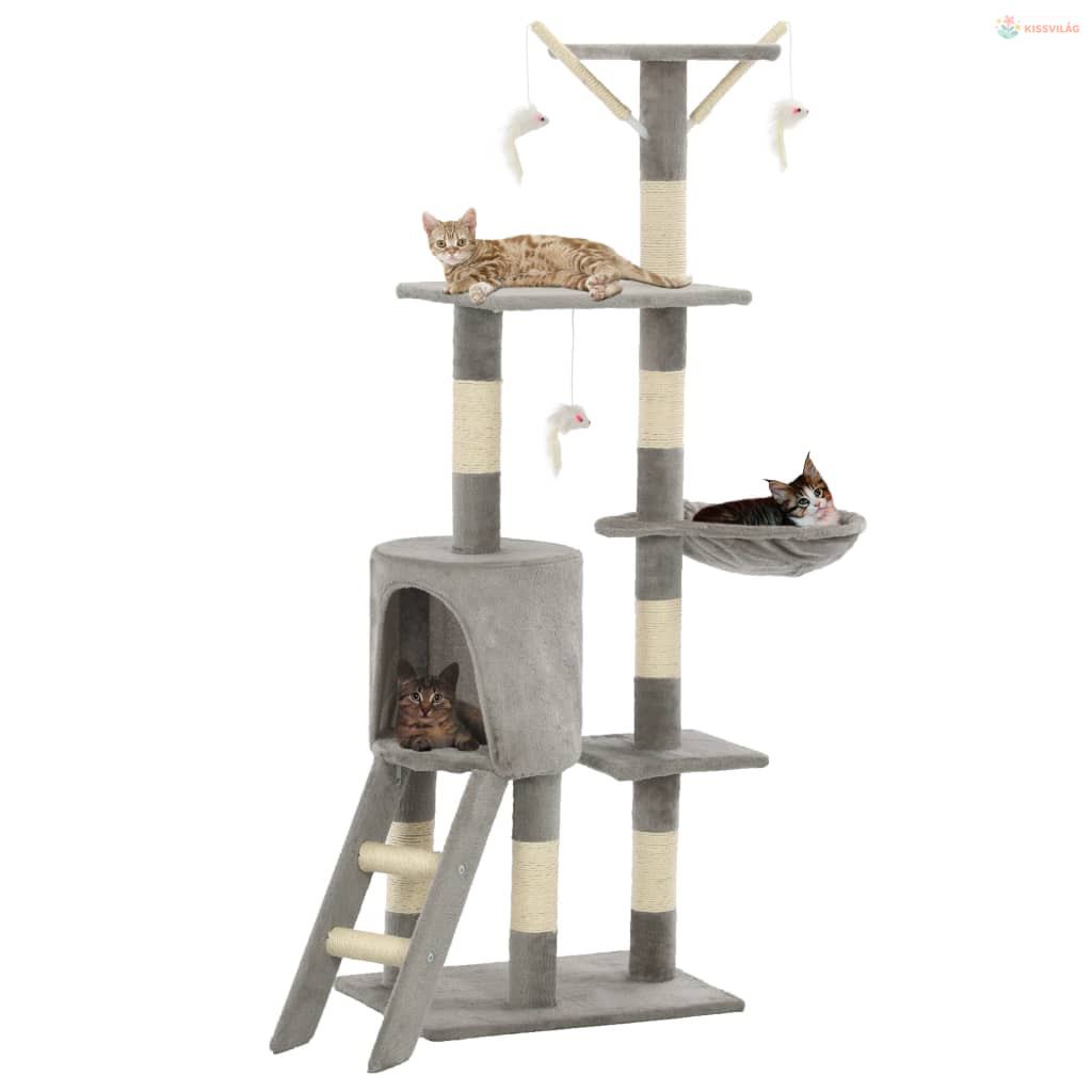 A plüssel kárpitozott kaparófák kényelmes szizálkötéllel vannak körbetekerve, így ideálisak arra, hogy szőrös kis barátja élesítse rajtuk a karmait. Macskái nagyon élvezni fogják, ahogy kergetik egymást, miközben le-fel ugrálnak erre a nagyszerű játszóközpontra. Macskabútorunk egy kényelmes házikóval is rendelkezik, ahol cicája alhat vagy pihenhet egy jót. Emellett 3 egeres játékkal, emelvényekkel és pihenőrészekkel van ellátva, hogy kis kedvence mindig jól érezze magát. A macskabútor alja strapabíró és stabil.