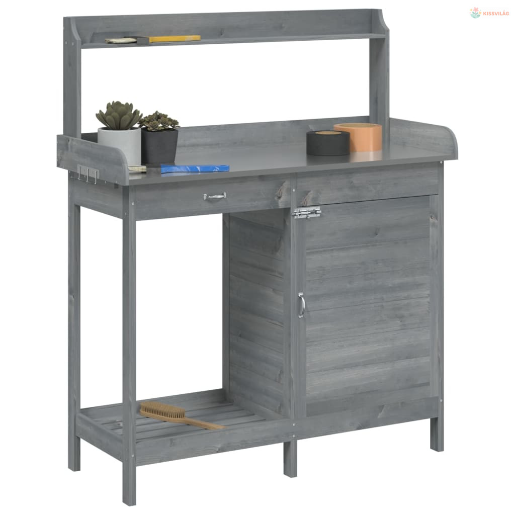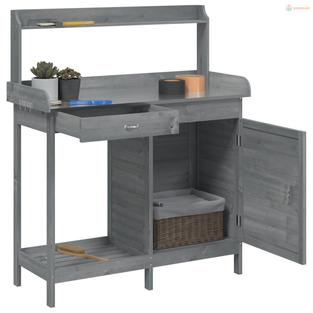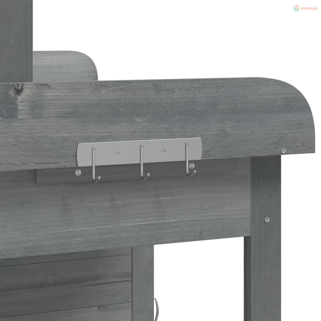 • Sokoldalú tárolóhely: Az ültető munkaasztal felső peremmel, alsó polccal, fiókkal, tárolószekrénnyel, és fémkampókkal rendelkezik az oldalán, így elegendő helyet biztosít a dolgai, mint például a kisebb kerti szerszámok, talaj, műtrágya stb. számára.