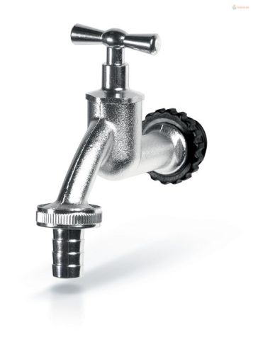 Csap esővízhordóhoz, könnyebb öntözőkannába, vödörbe önteni a vizet , praktikus karral. Fémből készült, méretek (hosszúság x szélesség x magasság): 15 x 4 x 16 cm, ezüst színű.