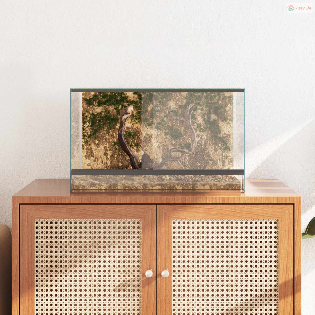 • Átlátszó üveg: A terrárium fő anyaga üveg, amit gondosan megmunkáltak, hogy akadálytalan kilátást biztosítson a hüllőidre vagy kétéltűeidre. A sima üveg hangsúlyozza a tisztaságot és az eleganciát, így a terrárium jól illik bármilyen modern belső térhez vagy kerthez.