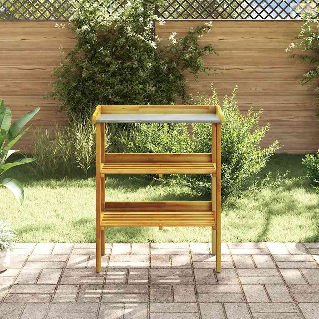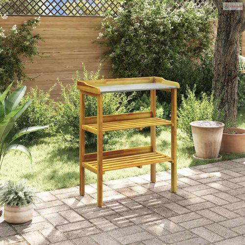 Az ültetőpad 2 polccal rendelkezik, mely elegendő helyet biztosít a különféle kerti szerszámoknak, hogy azok kertészkedés közben mindig a közelünkben legyenek. A cinkkel bevont asztallap felülete könnyen takarítható és vízálló, és a termék rusztikus hatását emeli ki.
