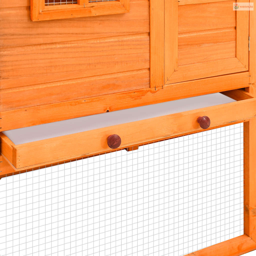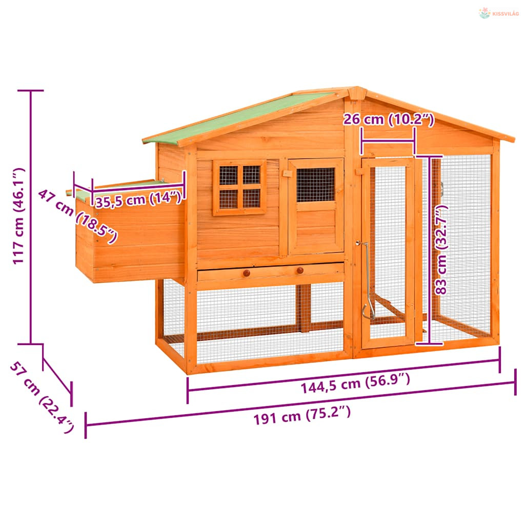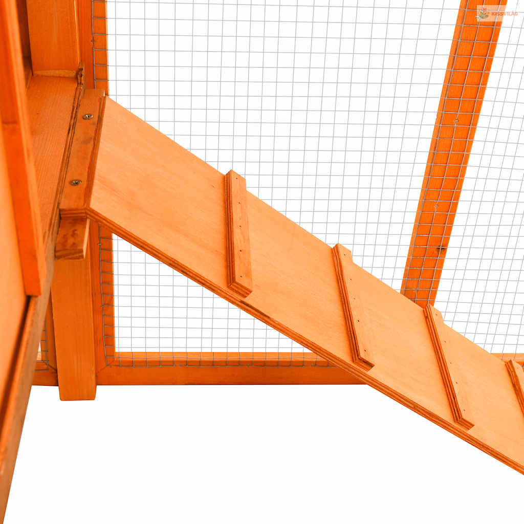A csirkeketrec egy házzal, egy tojóládával és egy nagyon nagy horganyzott acél dróthálóval rendelkezik, hogy figyelemmel kísérje a baromfit. Ez biztosítja a csirkék megfigyelését, és lehetővé teszi számukra, hogy elegendő friss levegőt kapjanak. A tyúkól tömör fenyőfa váza időtálló. A dönthető tetőt vízálló anyag borítja, így távol tartja az esőt. A búvóhely tökéletes alváshoz. Emellett a csúszásmentes rámpa az alsó emelettől a felsőig vezet, a kihúzható tálca pedig megkönnyíti a tisztítást.