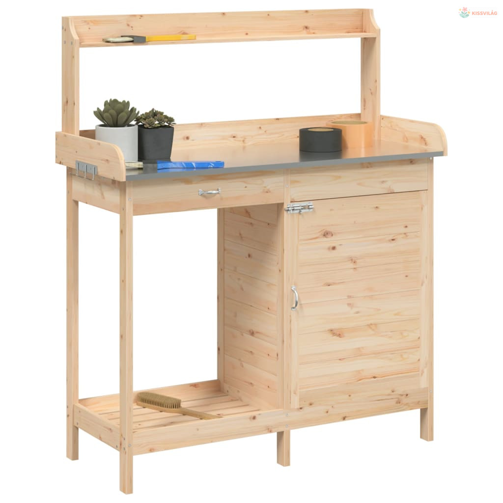 • Sokoldalú tárolóhely: Az ültető munkaasztal felső peremmel, alsó polccal, fiókkal, tárolószekrénnyel, és fémkampókkal rendelkezik az oldalán, így elegendő helyet biztosít a dolgai, mint például a kisebb kerti szerszámok, talaj, műtrágya stb. számára.