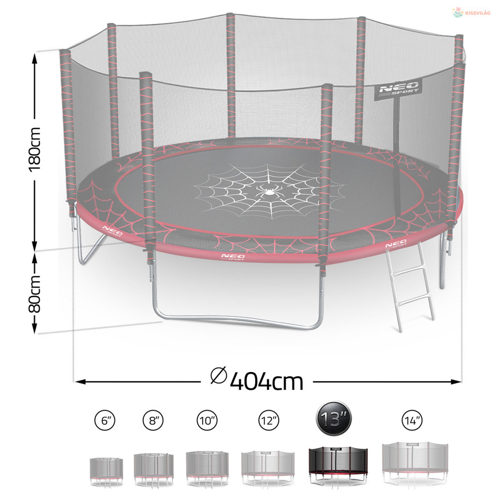 Ez a Kerti trambulin 13FT/404 cm külső védőhálóval és létrával Neo-Sport szuper választás, ha egy kis aktív kikapcsolódást vinnél a mindennapokba. Stabil kialakítása miatt otthoni használatra is jó megoldás.