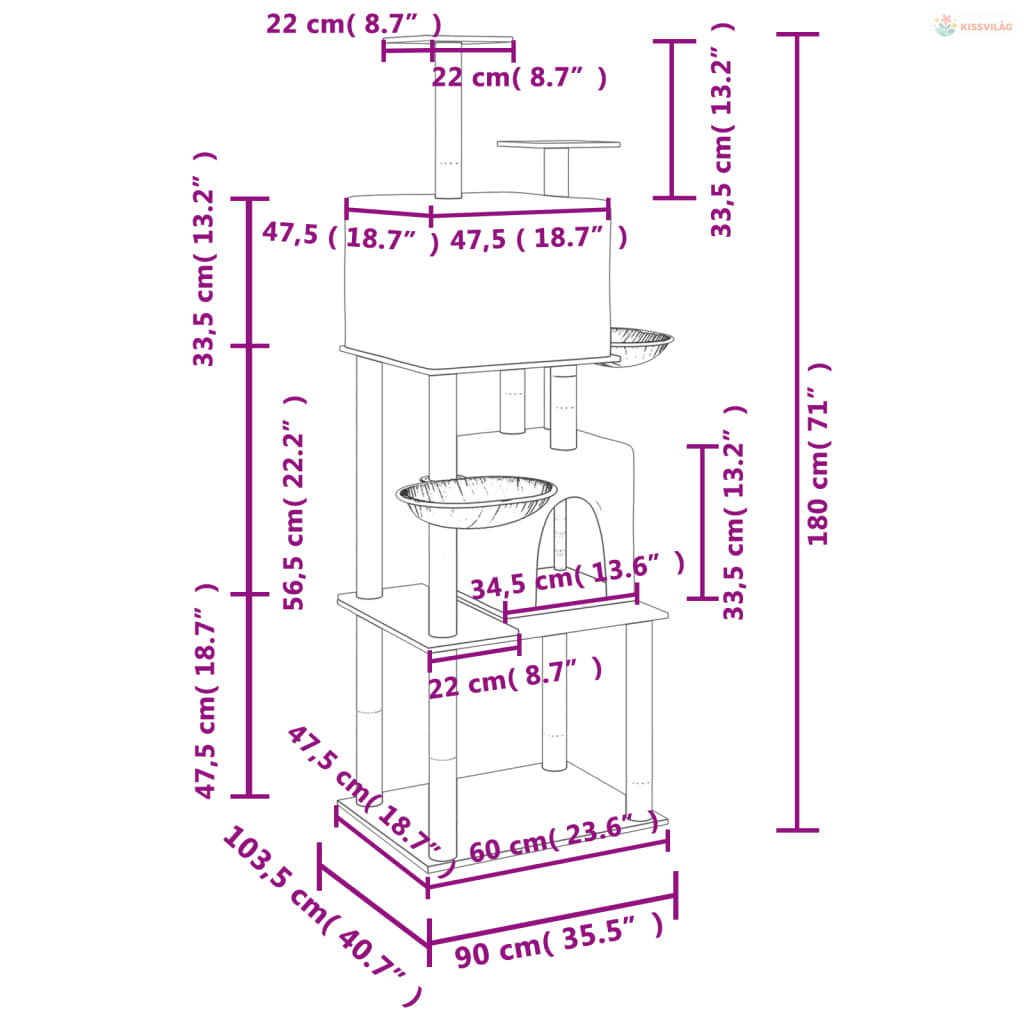 • Mindent magába foglaló kaparótorony: A többszintes macskabútor 2 házzal, 2 kosárral és több platformmal rendelkezik, tökéletes helyet biztosítva macskáinak a mászáshoz, környezetük megfigyeléséhez, a kaparáshoz, a bujkáláshoz és a pihenéshez.