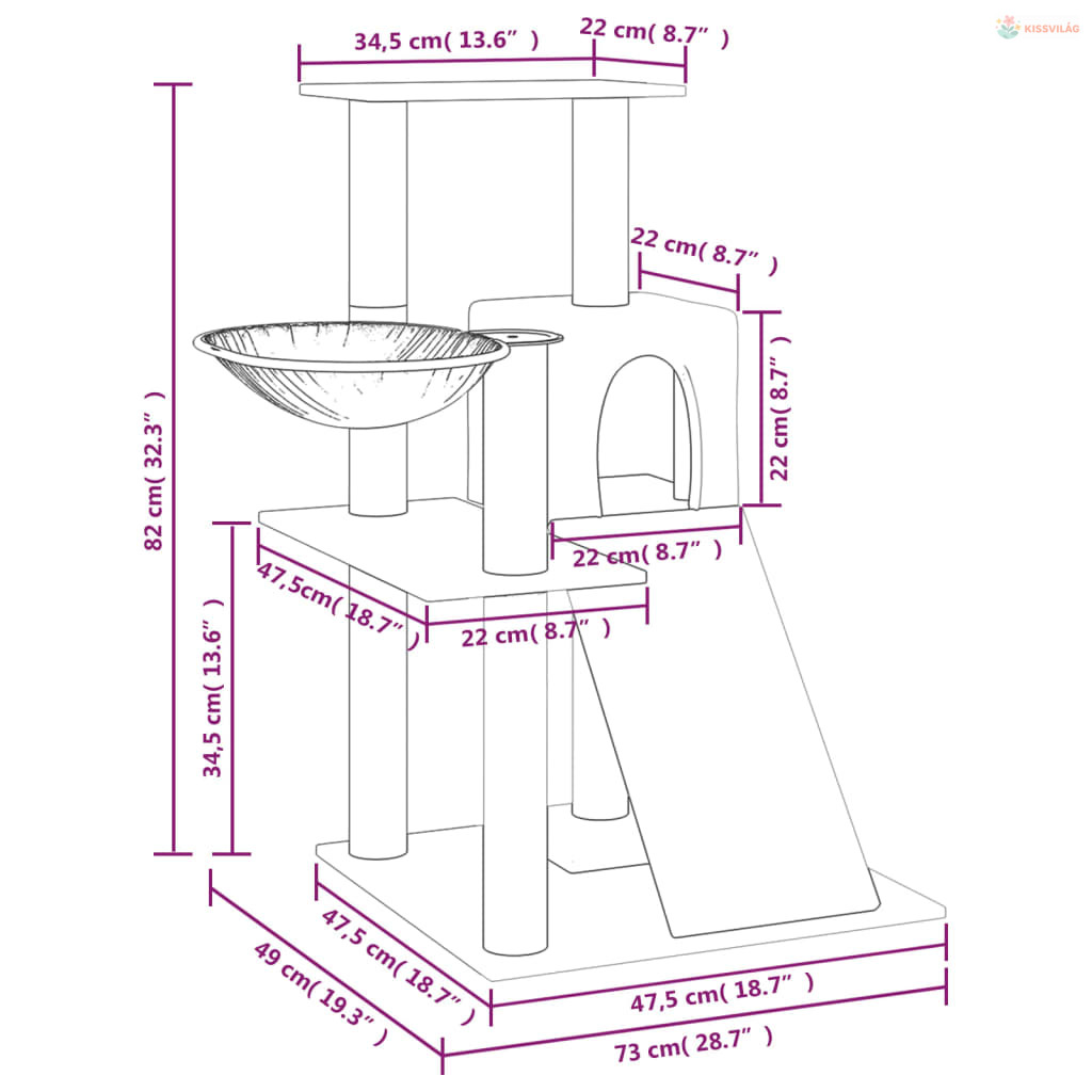 • Természetes szizáloszlopok: A kaparófa rugalmas és erős, természetes szizáloszlopai tökéletesek szeretett macskái számára, hogy kielégítsék kaparóösztönüket, és ne a bútorait karcolják meg.