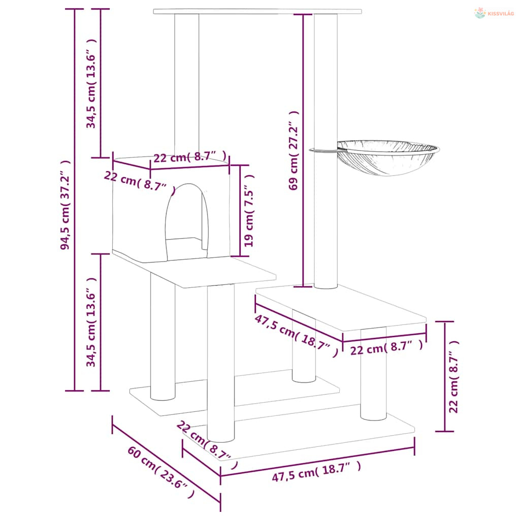 • Mindent magában foglaló macskatorony: A többszintes macskabútor 1 házzal, 1 függőággyal és emelvényekkel rendelkezik, tökéletes helyet biztosítva macskáinak a mászáshoz, környezetük megfigyeléséhez, a kaparáshoz, a bujkáláshoz és a pihenéshez.
