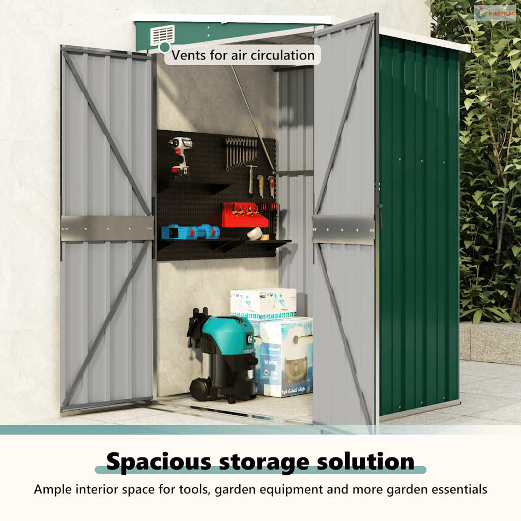 Mivel horganyzott acélból és fémből készült, a tároló minimális karbantartást igényel és nagyon tartós. Az elülső dupla nyíló ajtók könnyű be- és kijutást tesznek lehetővé. A zárható műanyag fogantyú biztosítja a tárgy biztonságát. Ezenkívül az esővíz automatikusan elfolyik a tetőről a lejtős kialakításnak köszönhetően.