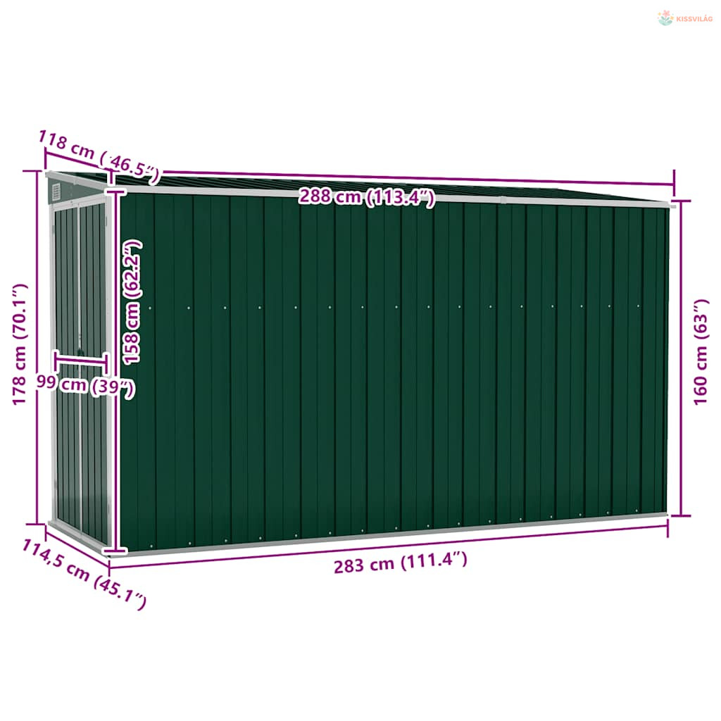 Zöld acél falhoz erősíthető kerti fészer 118 x 288 x 178 cm
