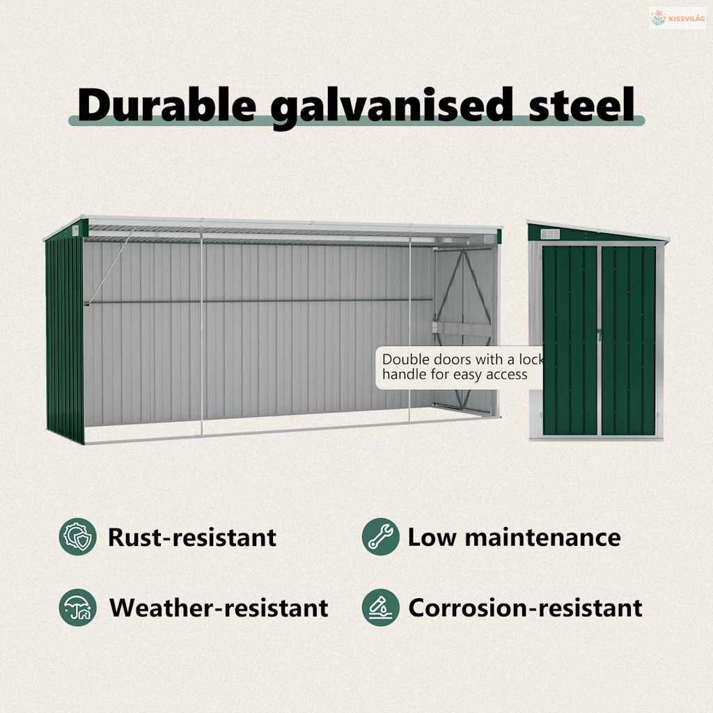 Mivel horganyzott acélból és fémből készült, a tároló minimális karbantartást igényel és nagyon tartós. Az elülső dupla nyíló ajtók könnyű be- és kijutást tesznek lehetővé. A zárható műanyag fogantyú biztosítja a tárgy biztonságát. Ezenkívül az esővíz automatikusan elfolyik a tetőről a lejtős kialakításnak köszönhetően.