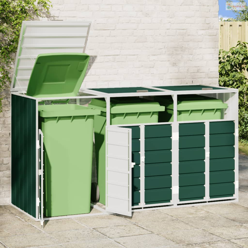 Zöld acél kerekes szemetes tároló 3 szemeteskukához 216 x 81 x 115 cm