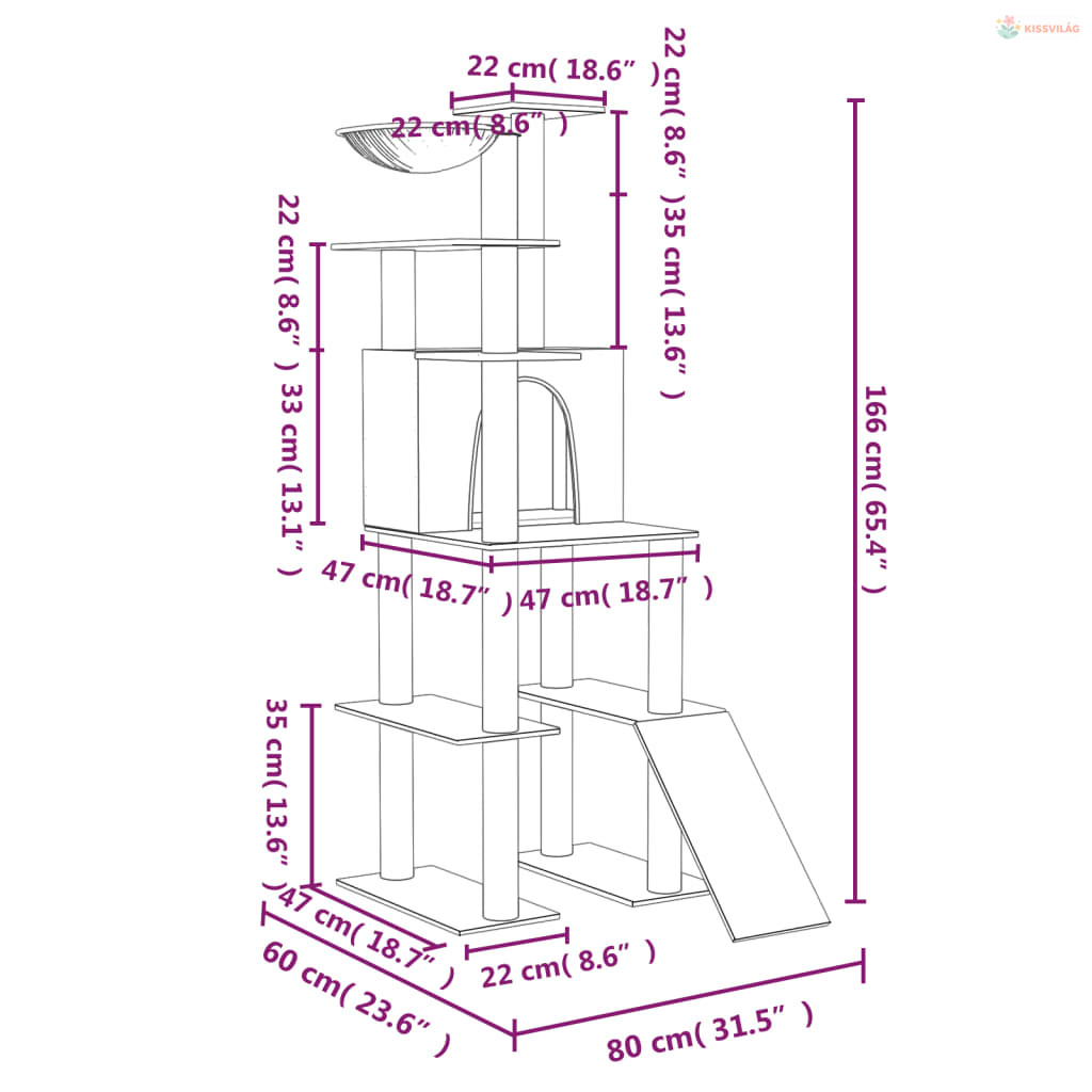• Természetes szizáloszlopok: A kaparófa rugalmas és erős, természetes szizáloszlopai tökéletesek szeretett macskái számára, hogy kielégítsék kaparóösztönüket, és ne a bútorait karcolják meg.
