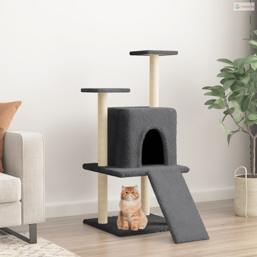 Sötétszürke macskabútor szizál kaparófákkal 110 cm