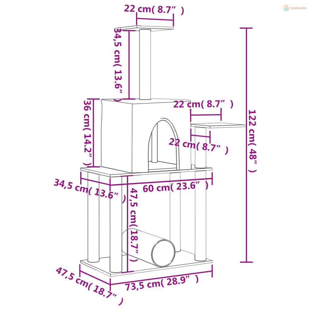 • Minden egyben macskatorony: A többszintes macskabútor egy házzal, egy alagúttal és platformokkal lett ellátva, tökéletes helyet biztosítva macskáinak a mászáshoz, kaparáshoz, bujkáláshoz és pihenéshez.