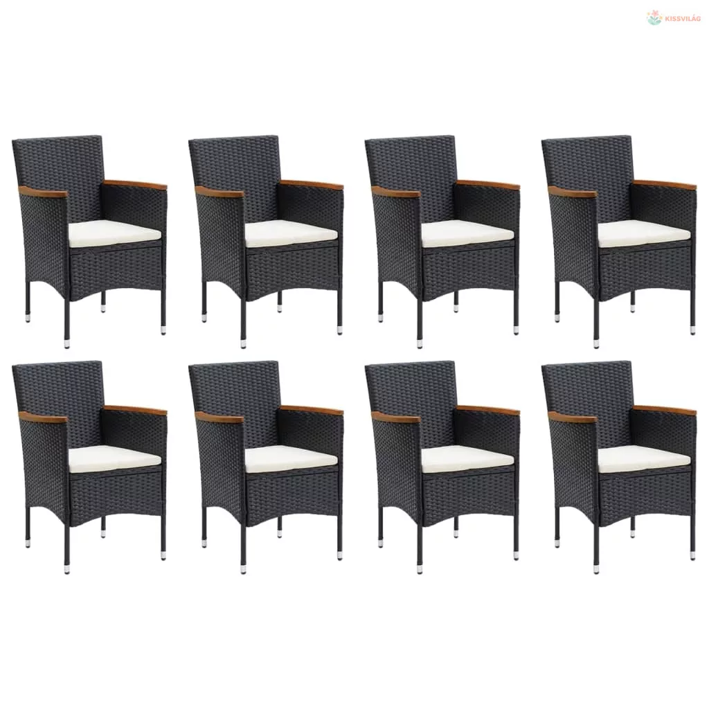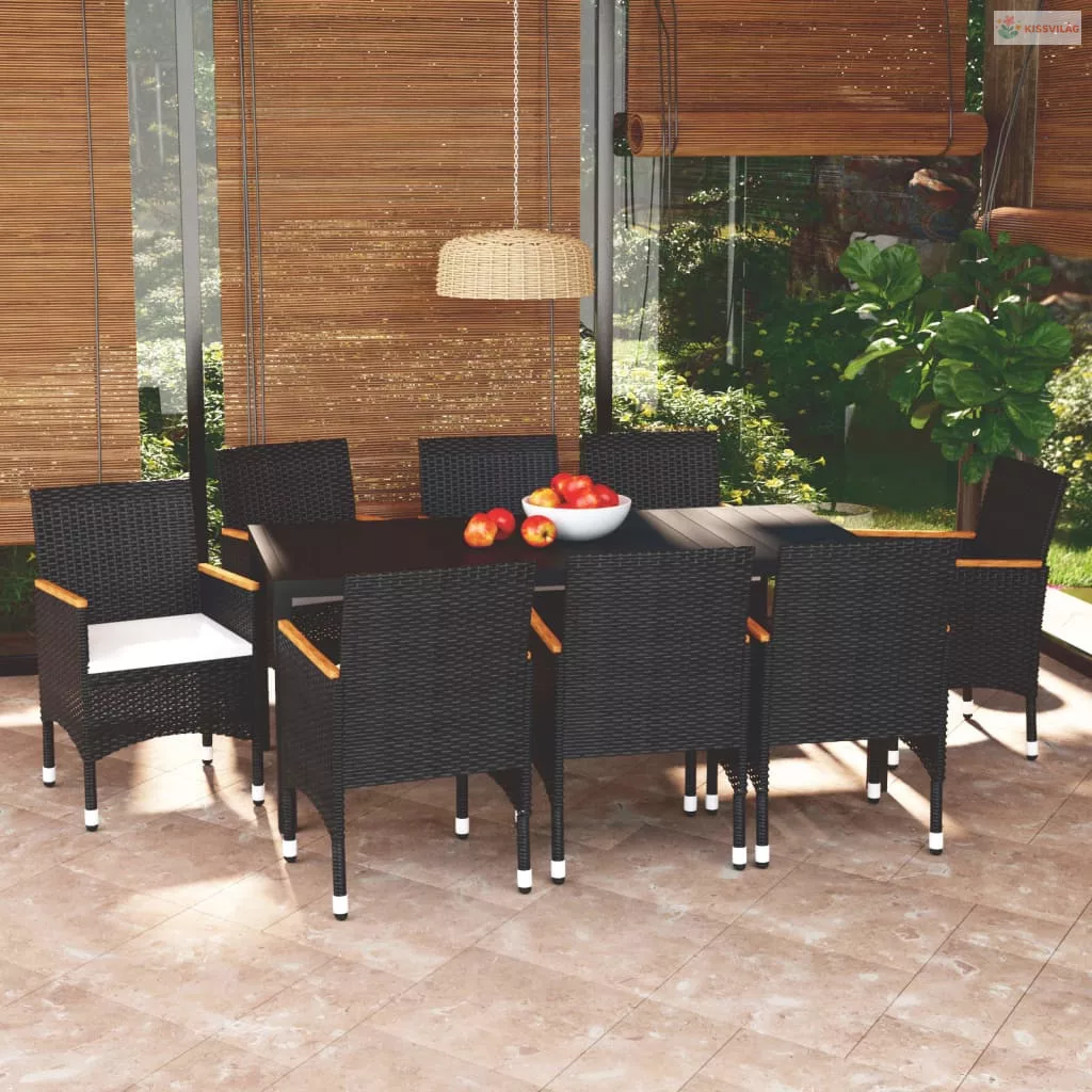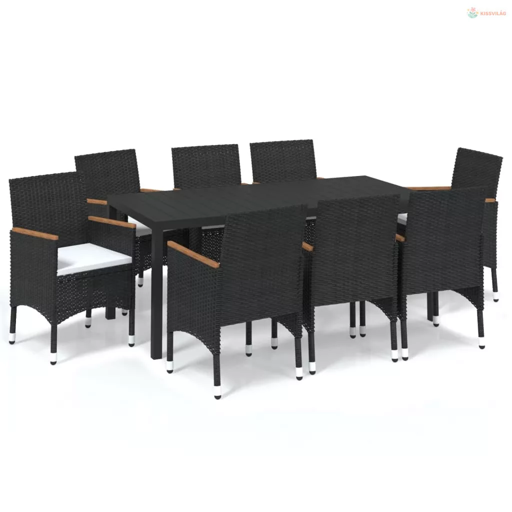 9 részes fekete polyrattan kerti étkezőgarnitúra párnákkal