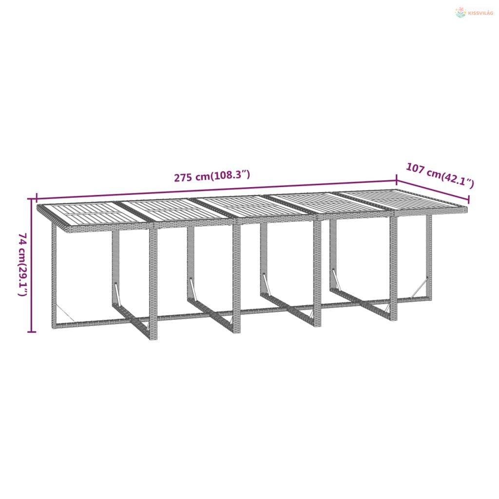 • Asztal teljes mérete: 275 x 107 x 74 cm (Ho x Szé x Ma)