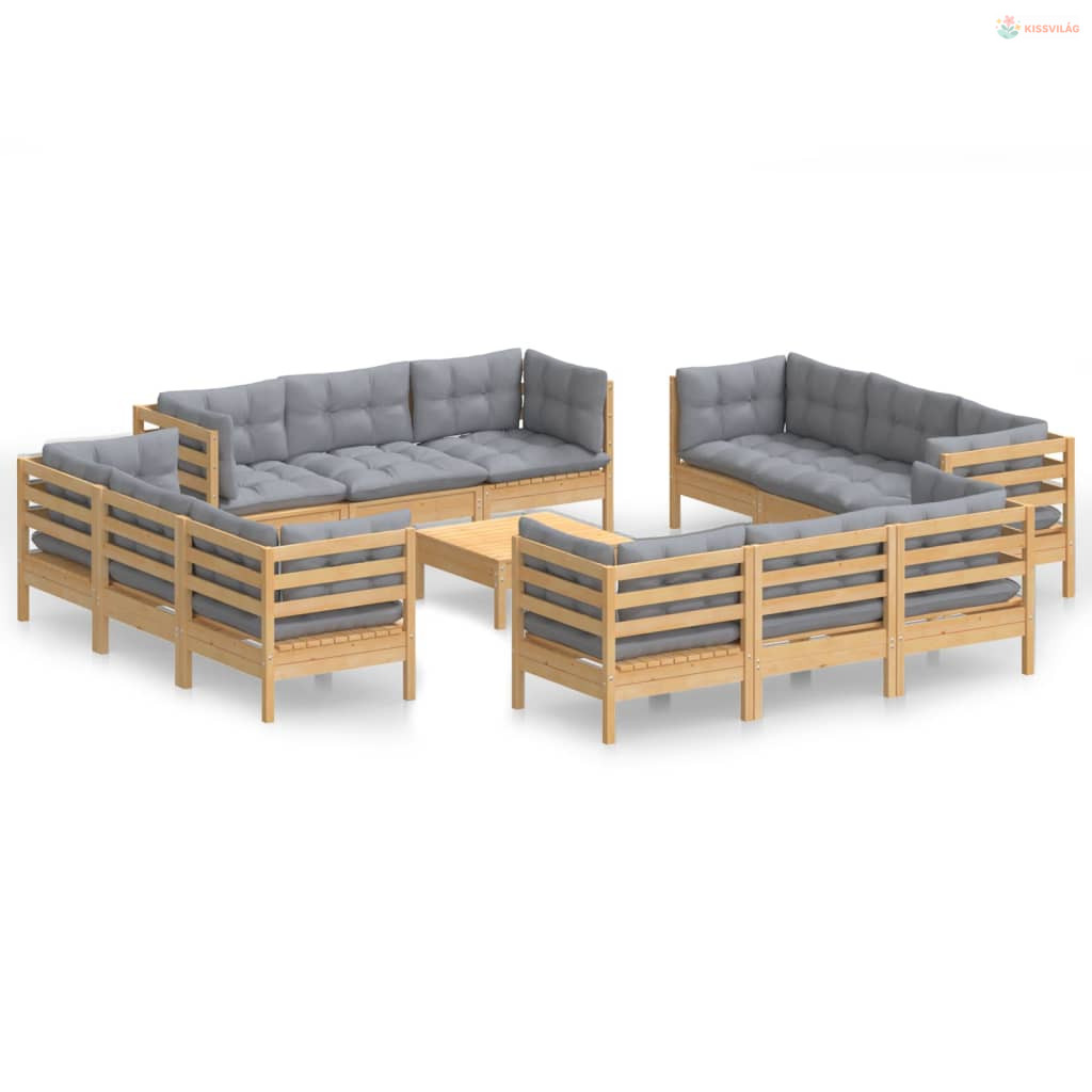 13 részes fenyőfa kerti ülőgarnitúra szürke párnákkal