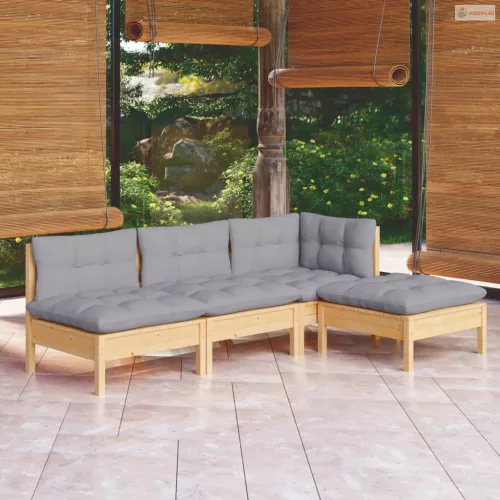 4 részes fenyőfa kerti ülőgarnitúra szürke párnákkal
