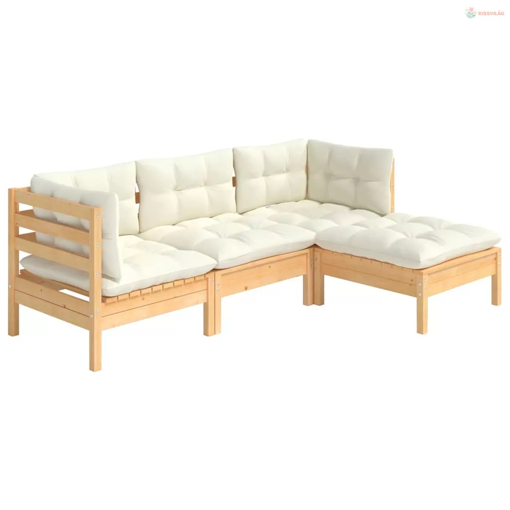 4 részes fenyőfa kerti ülőgarnitúra krémszínű párnákkal