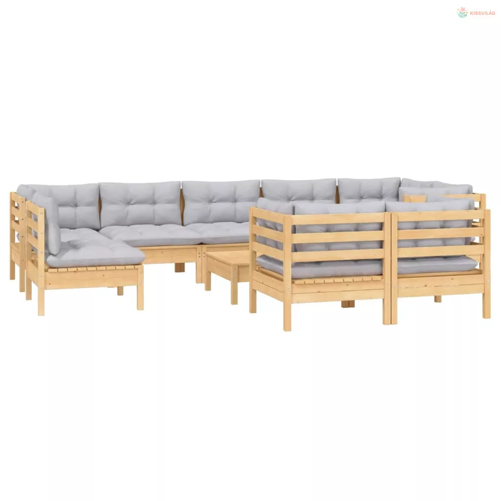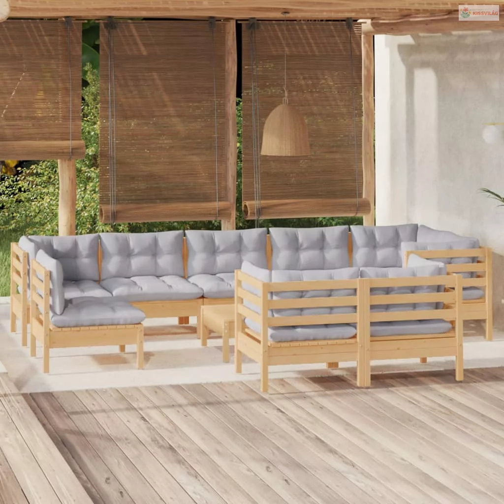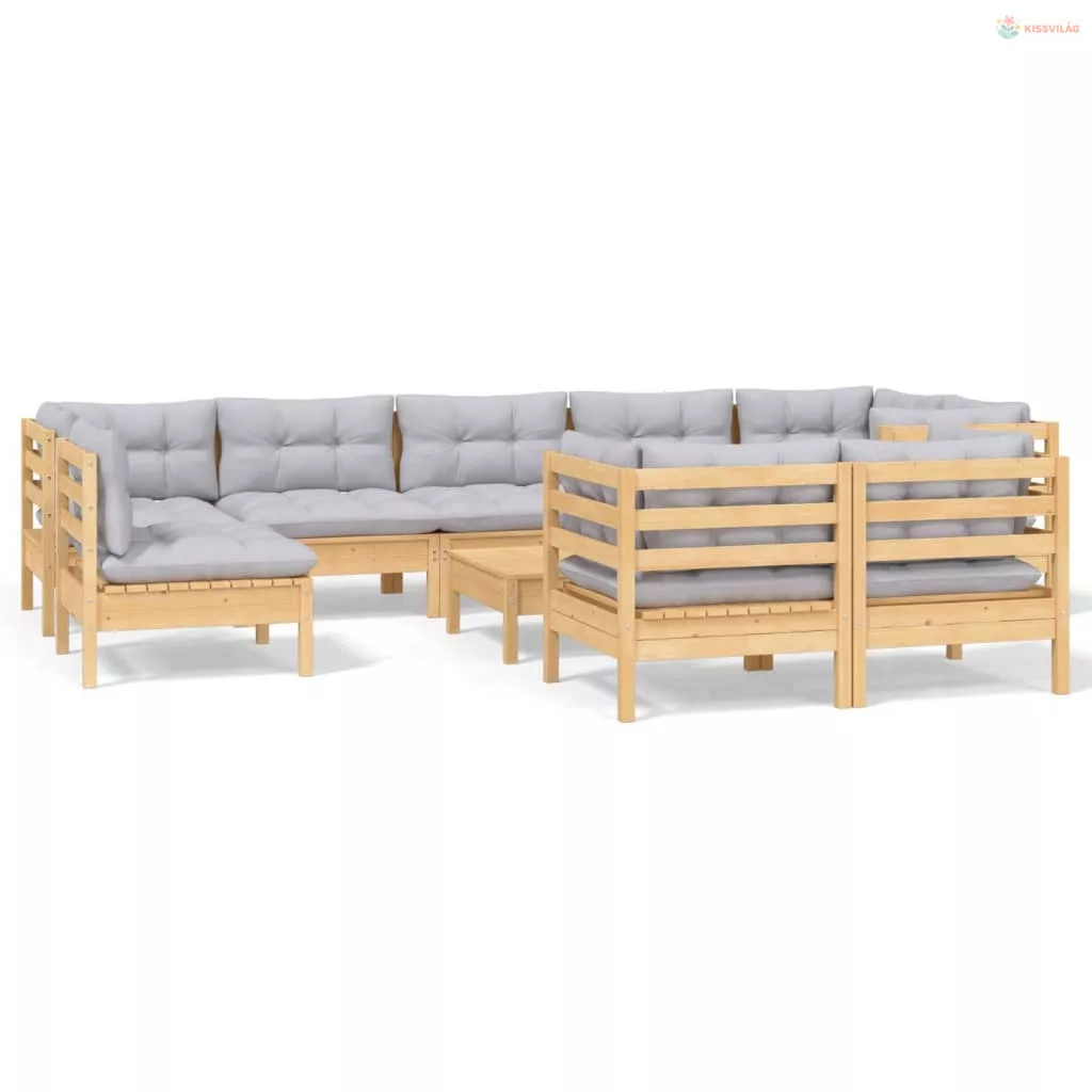 10 részes tömör fenyőfa kerti ülőgarnitúra szürke párnákkal