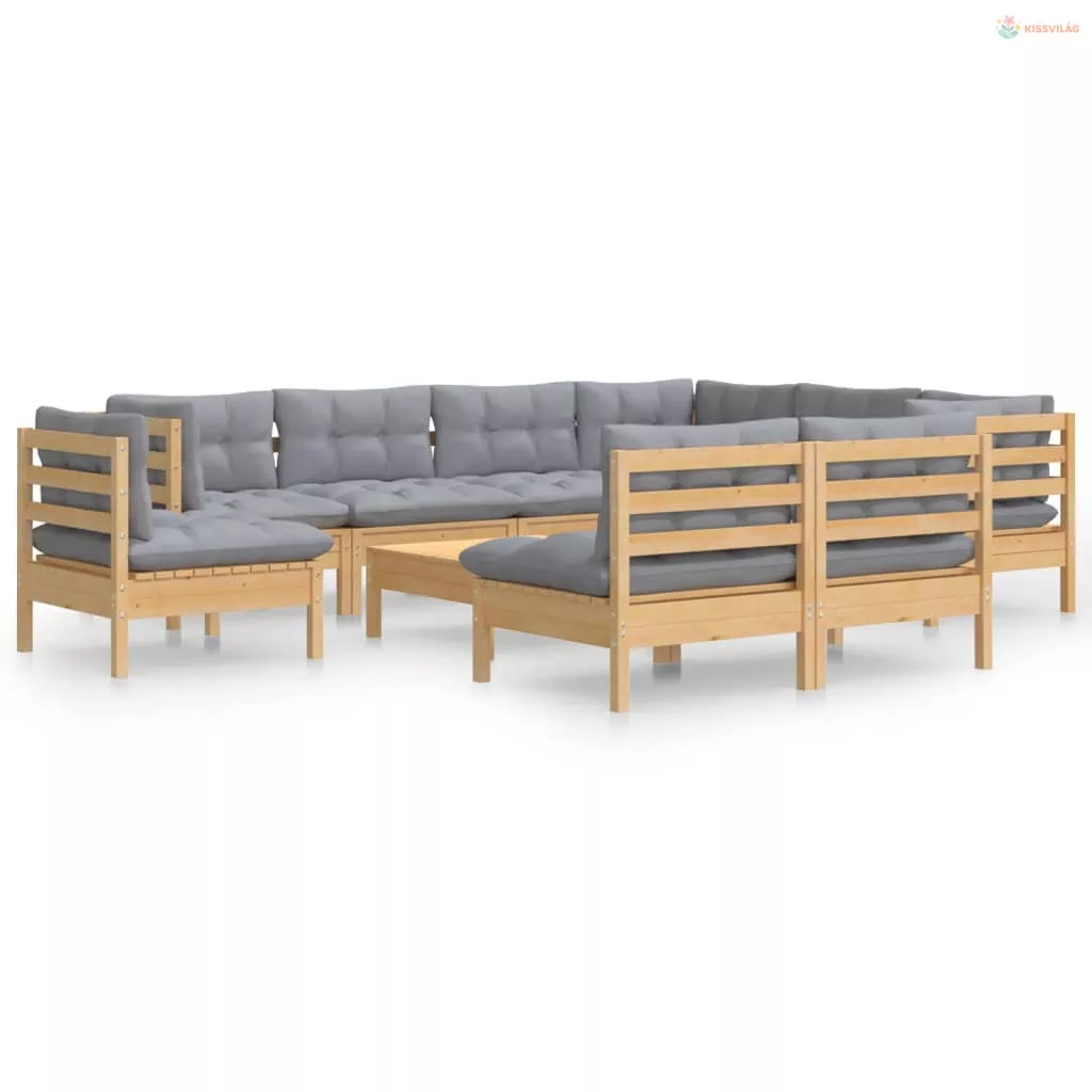 10 részes tömör fenyőfa kerti ülőgarnitúra szürke párnákkal