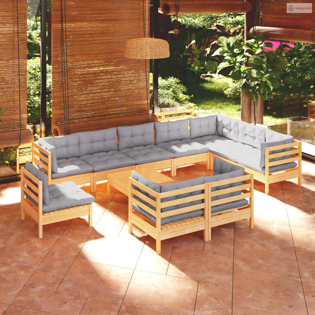 11 részes tömör fenyőfa kerti ülőgarnitúra szürke párnákkal