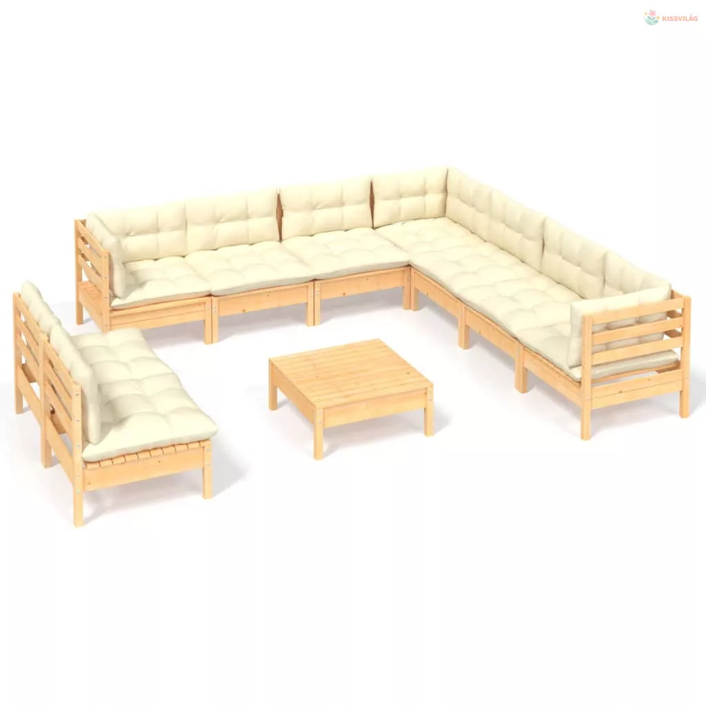 10 részes tömör fenyőfa kerti ülőgarnitúra krémszínű párnákkal