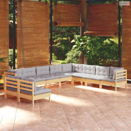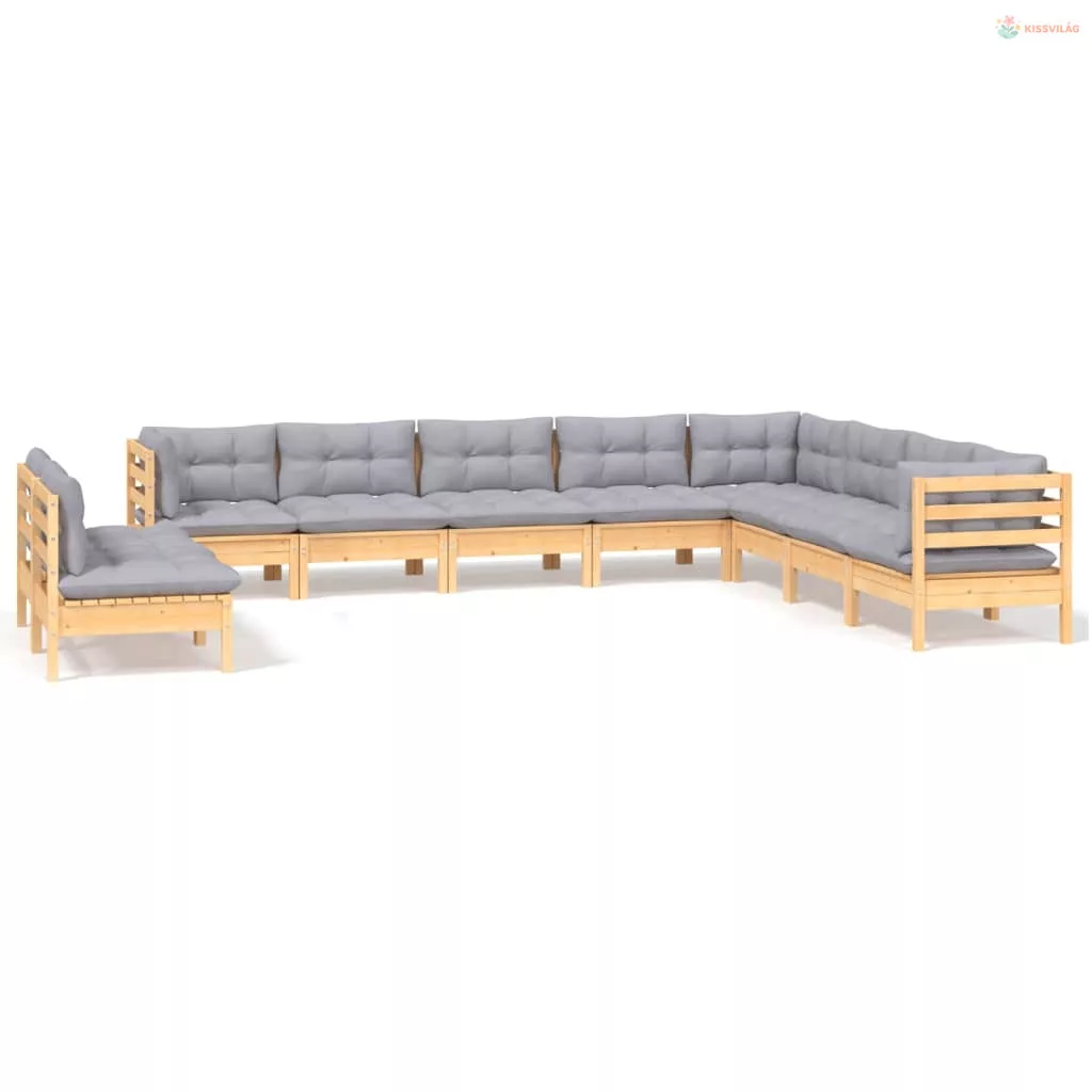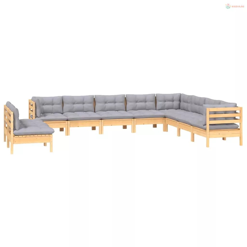 10 részes tömör fenyőfa kerti ülőgarnitúra szürke párnákkal