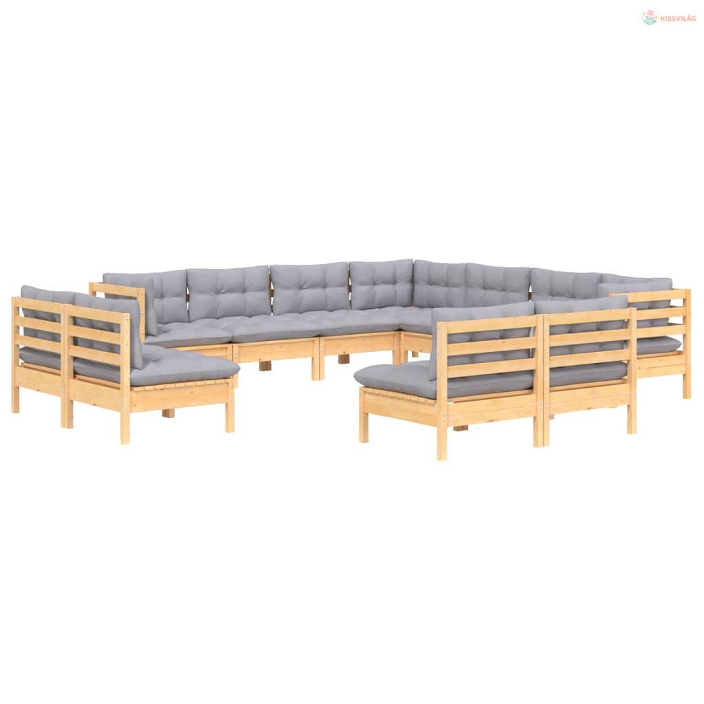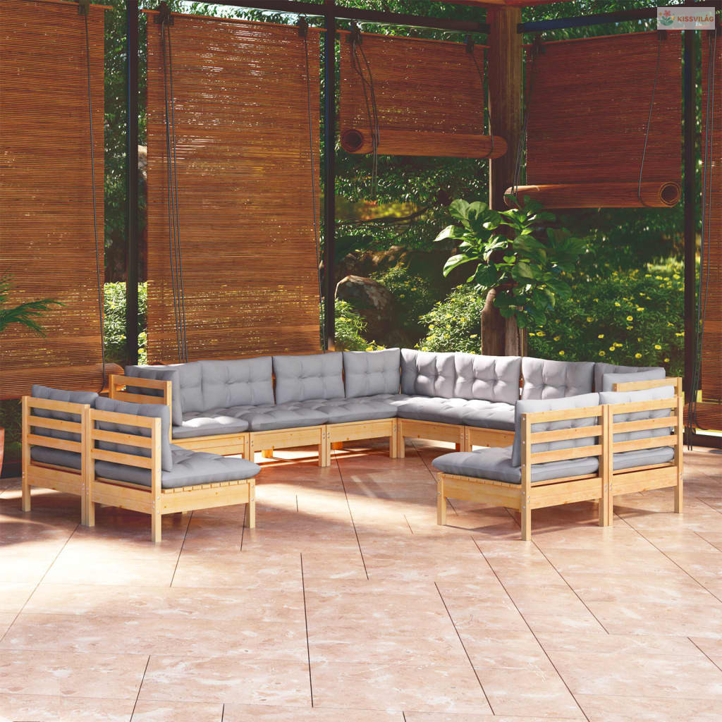 11 részes tömör fenyőfa kerti ülőgarnitúra szürke párnákkal