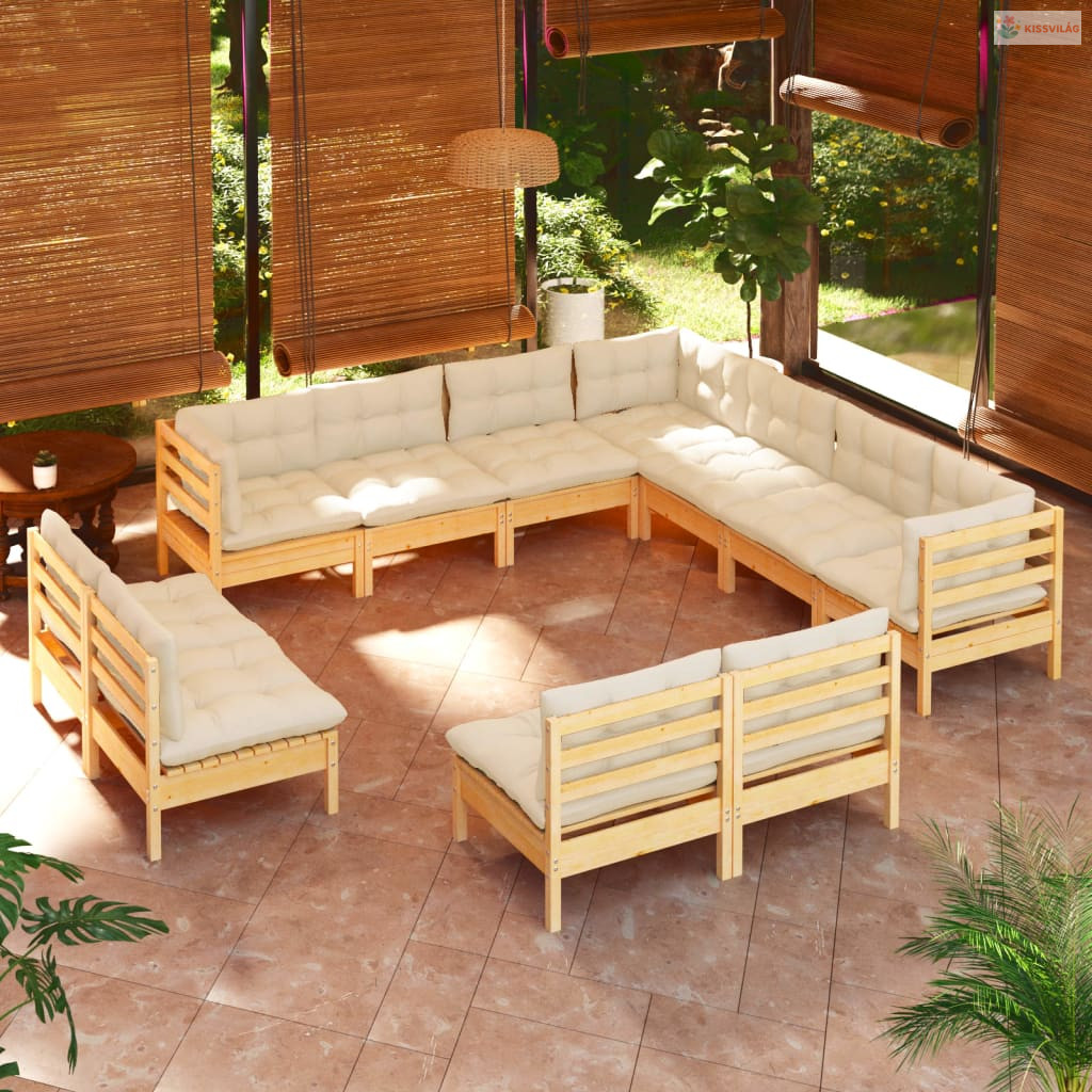 11 részes tömör fenyőfa kerti ülőgarnitúra krémszínű párnákkal