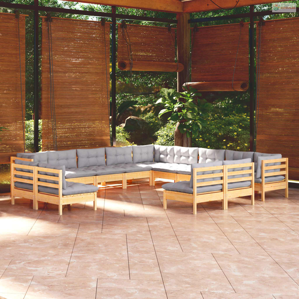 13 részes tömör fenyőfa kerti ülőgarnitúra szürke párnákkal