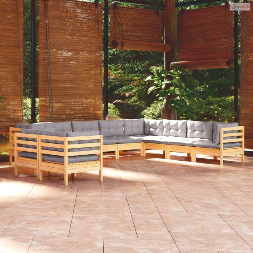 10 részes tömör fenyőfa kerti ülőgarnitúra szürke párnákkal