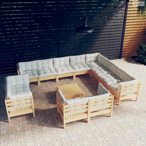 13 részes tömör fenyőfa kerti ülőgarnitúra krémszínű párnákkal