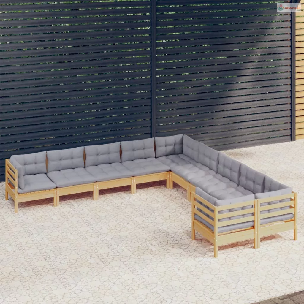 10 részes fenyőfa kerti ülőgarnitúra szürke párnákkal