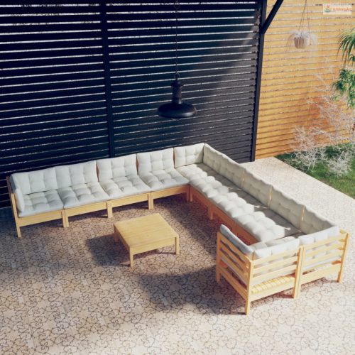 11 részes fenyőfa kerti ülőgarnitúra krémszínű párnákkal