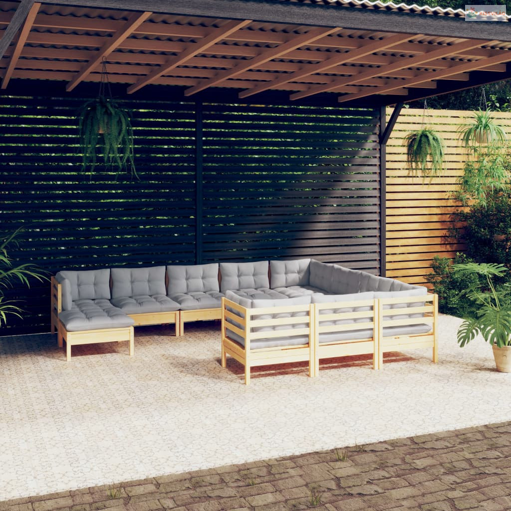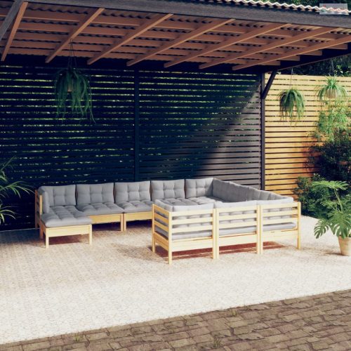 11 részes fenyőfa kerti ülőgarnitúra szürke párnákkal