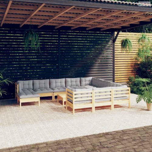 12 részes fenyőfa kerti ülőgarnitúra szürke párnákkal