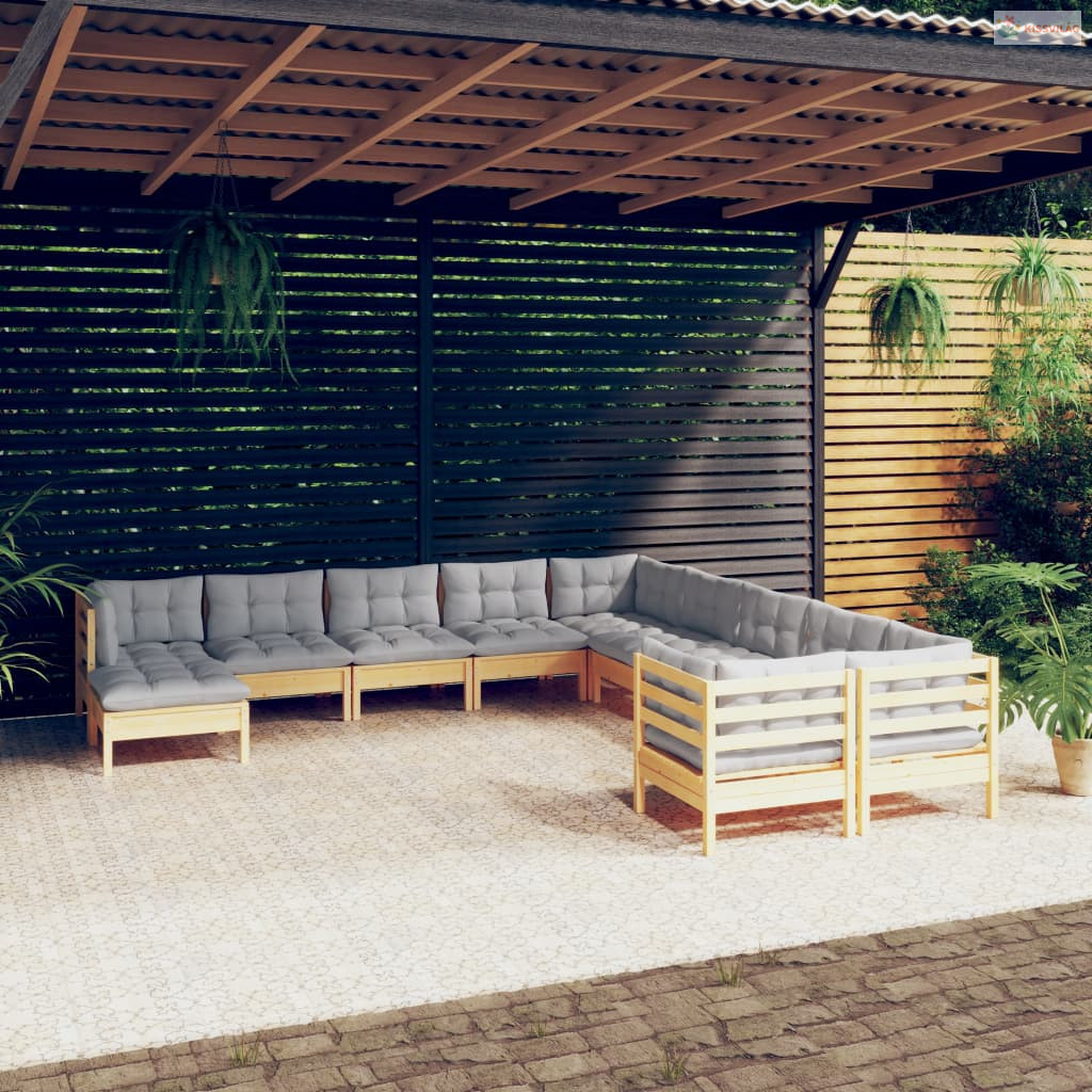 11 részes fenyőfa kerti ülőgarnitúra szürke párnákkal