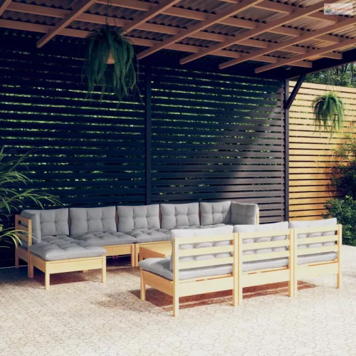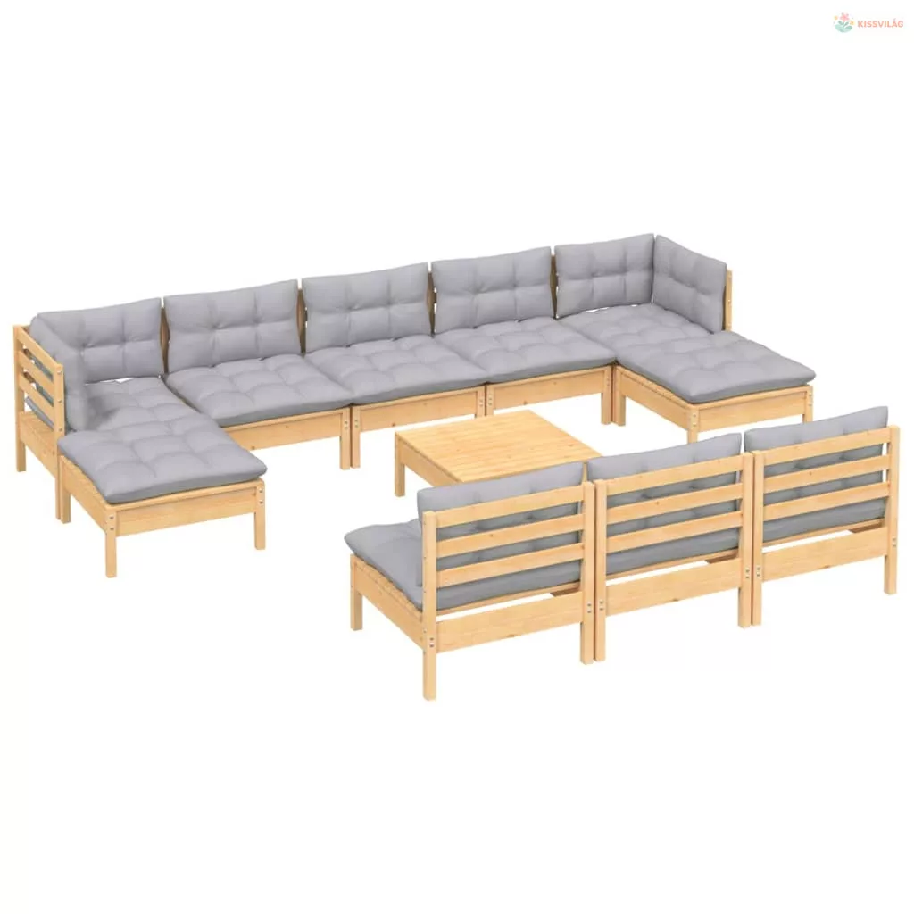 11 részes fenyőfa kerti ülőgarnitúra szürke párnákkal