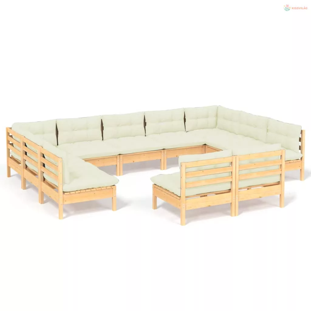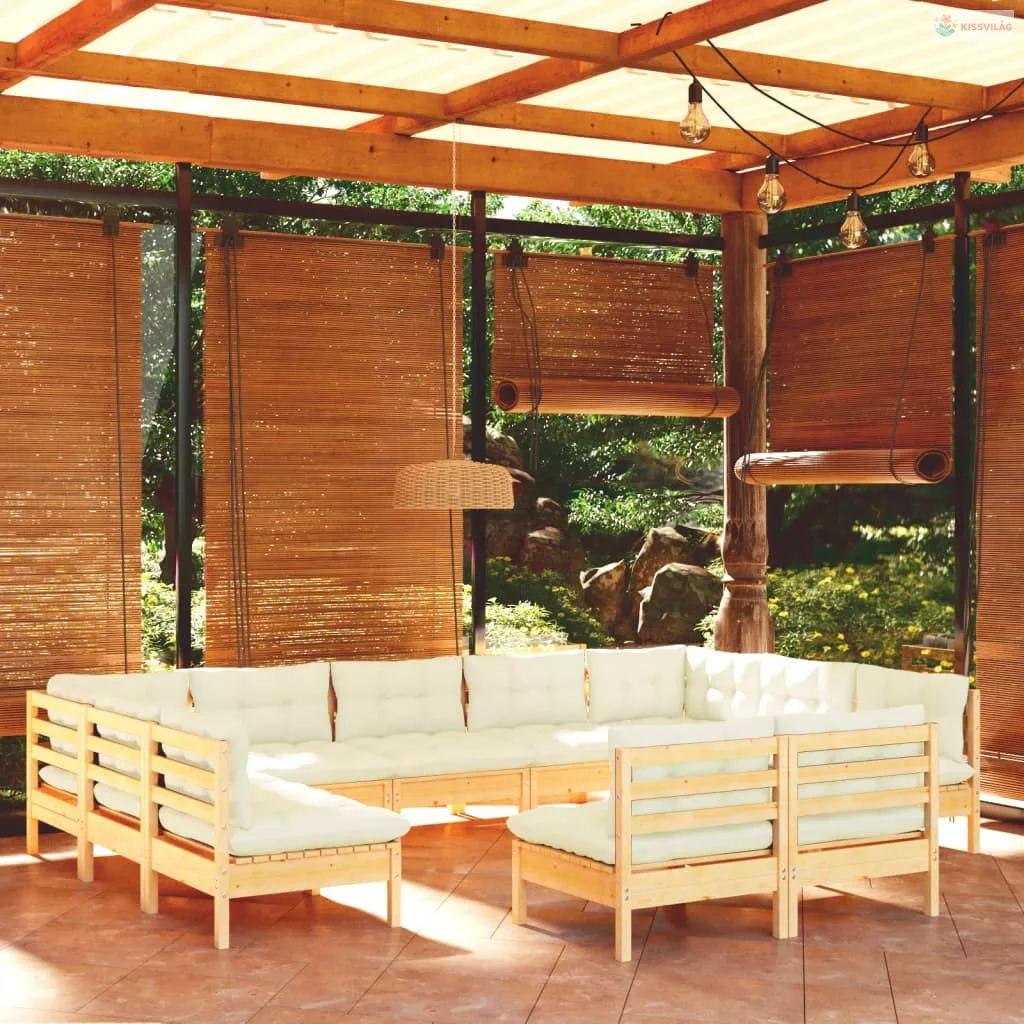 11 részes tömör fenyőfa kerti ülőgarnitúra krémszínű párnákkal