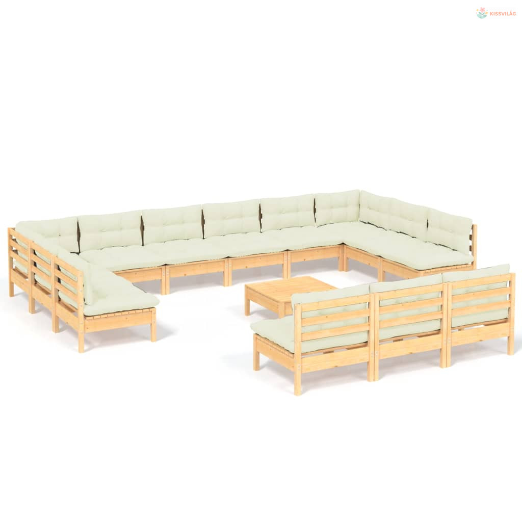 14 részes tömör fenyőfa kerti ülőgarnitúra krémszínű párnákkal