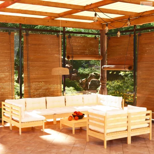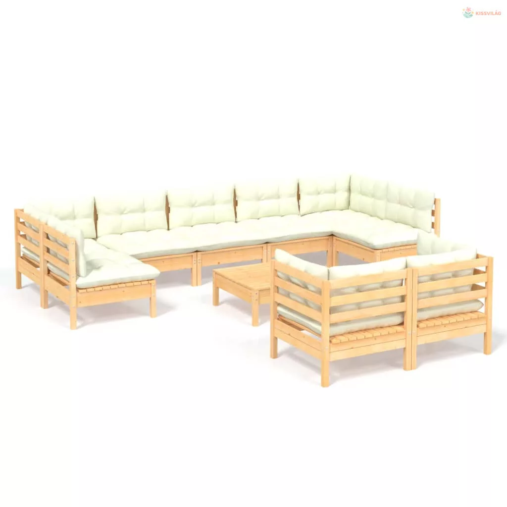 10 részes tömör fenyőfa kerti ülőgarnitúra krémszínű párnákkal