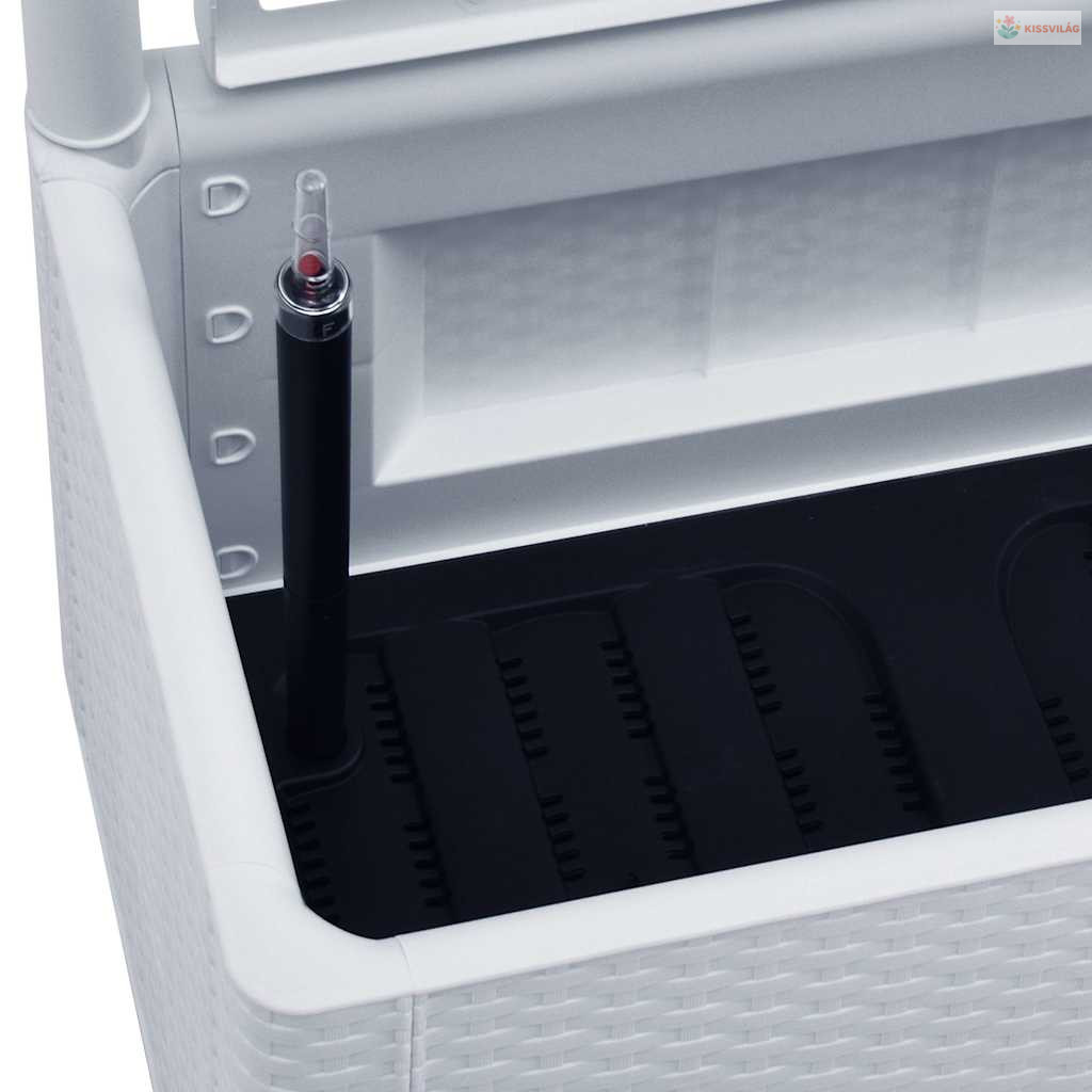 A beépített rács kiváló támaszt biztosít a kúszónövények, például gyógynövények, paradicsom, bab stb. számára. Strapabíró UV-, időjárás- és fagyálló műanyagból készült, így bel- és kültéri használatra is alkalmas. A kialakítás megtévesztően hasonlít a valódi rattan szerkezetre. Az anyag mosható és könnyen tisztítható. Emellett ez a láda automatikusan képes öntözni a növényeket, nedvességet vezetve 90 literes víztartályából, és túlfolyó nyílásokkal rendelkezik a túlöntözés megakadályozása érdekében. A szintjelző alaptartozék.