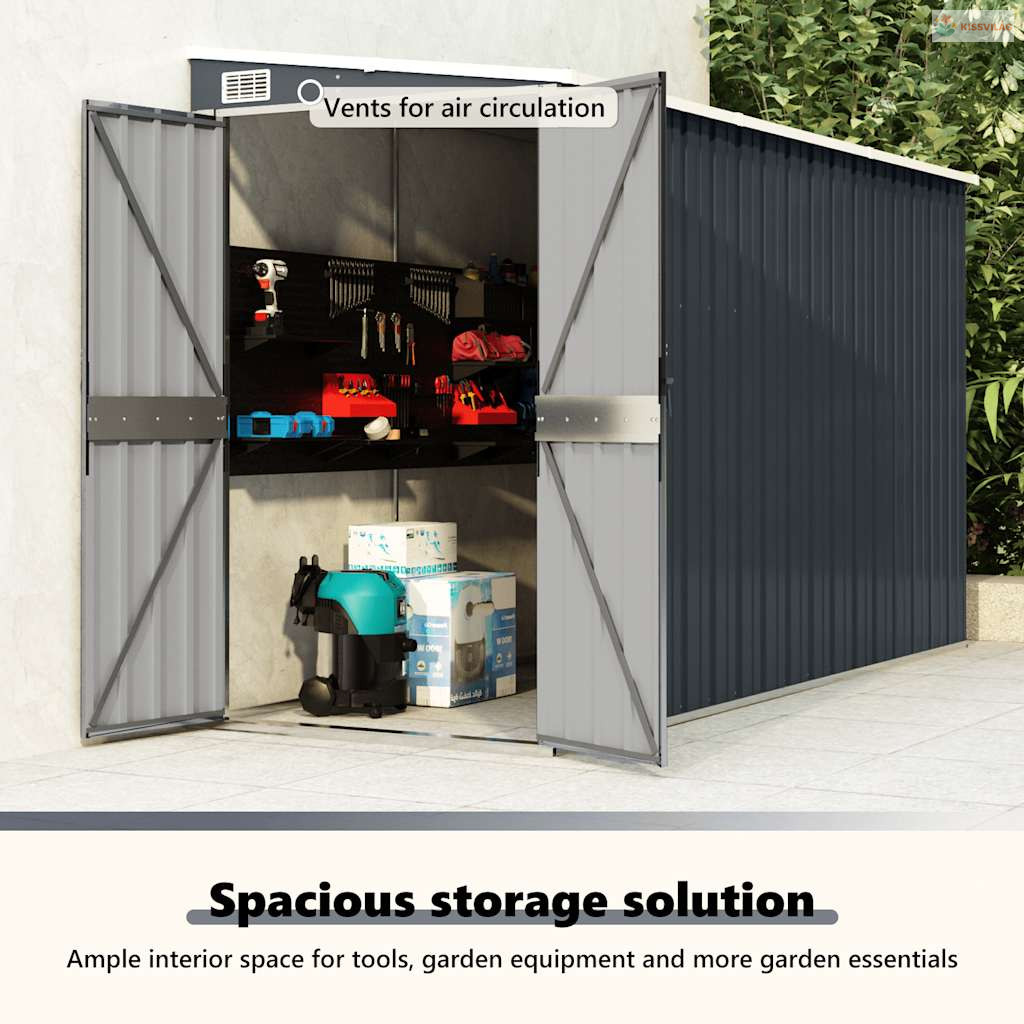 Mivel horganyzott acélból és fémből készült, a tároló minimális karbantartást igényel és nagyon tartós. Az elülső dupla nyíló ajtók könnyű be- és kijutást tesznek lehetővé. A zárható műanyag fogantyú biztosítja a tárgy biztonságát. Ezenkívül az esővíz automatikusan elfolyik a tetőről a lejtős kialakításnak köszönhetően.