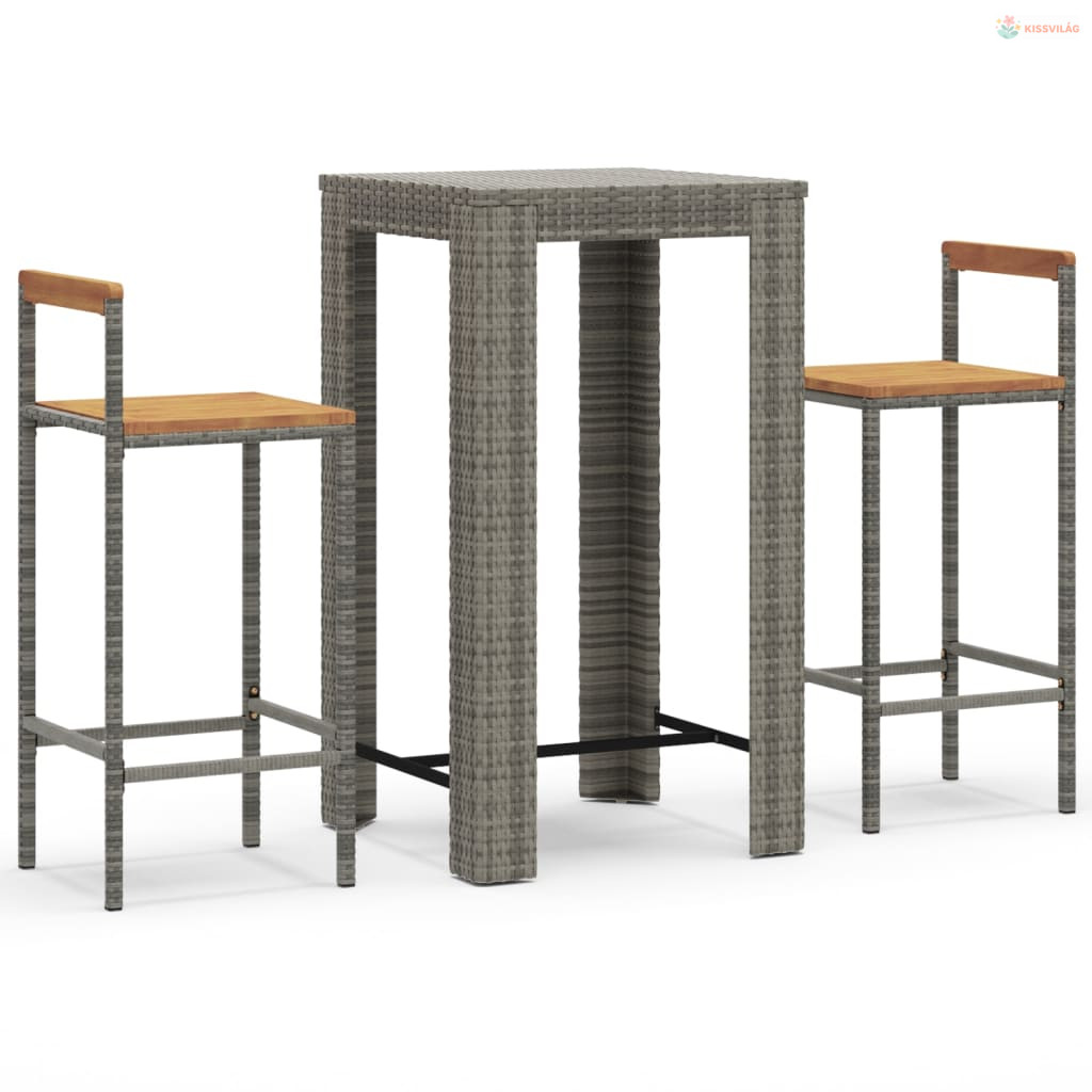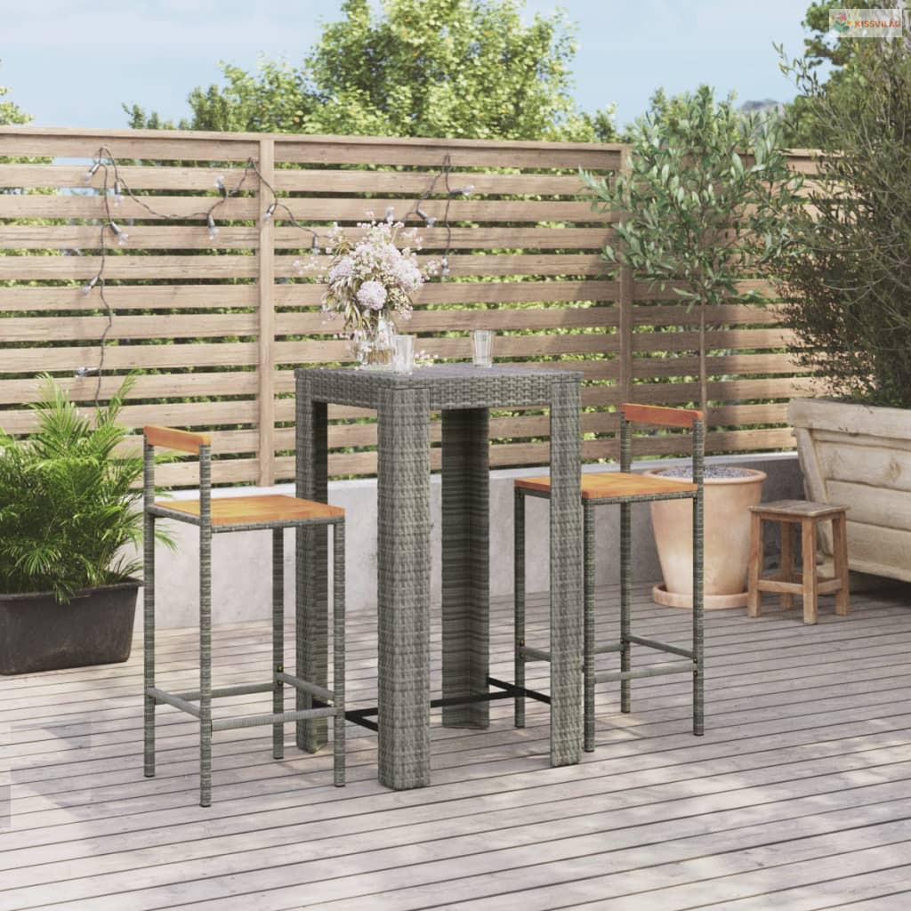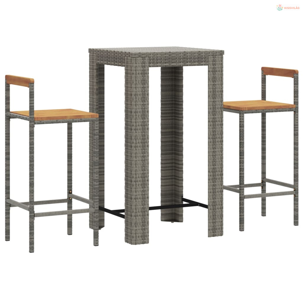 3 részes szürke polyrattan és tömör akácfa kerti bárszett