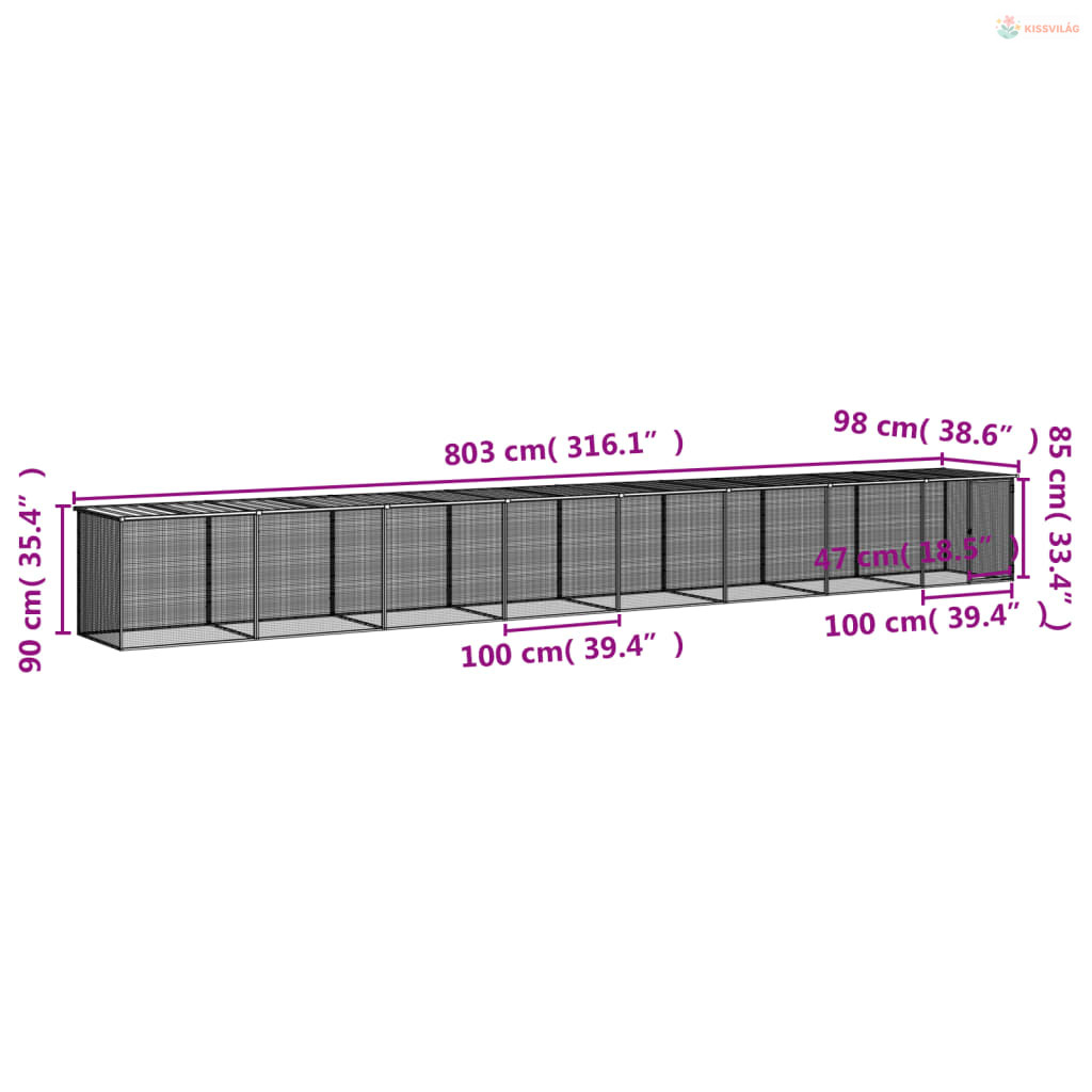 Világosszürke horganyzott acél tyúkketrec tetővel 803x98x90 cm