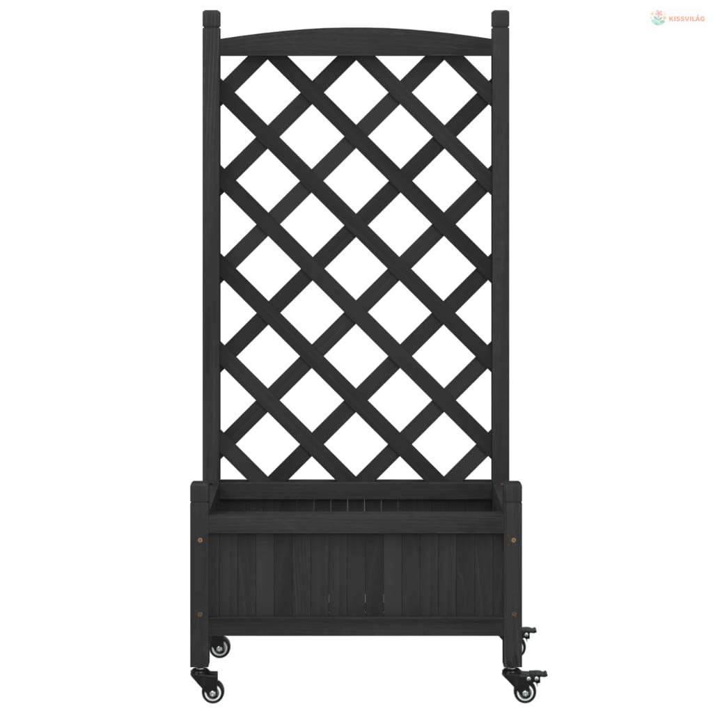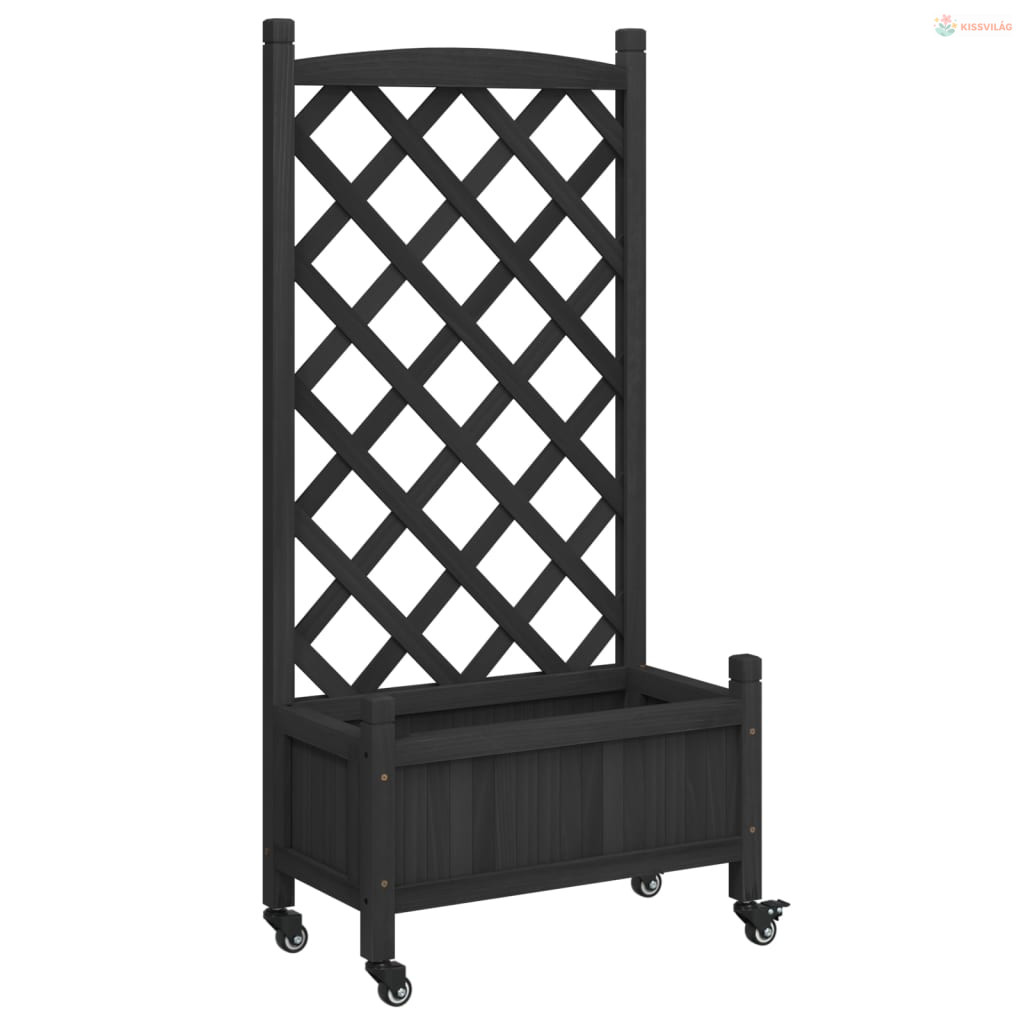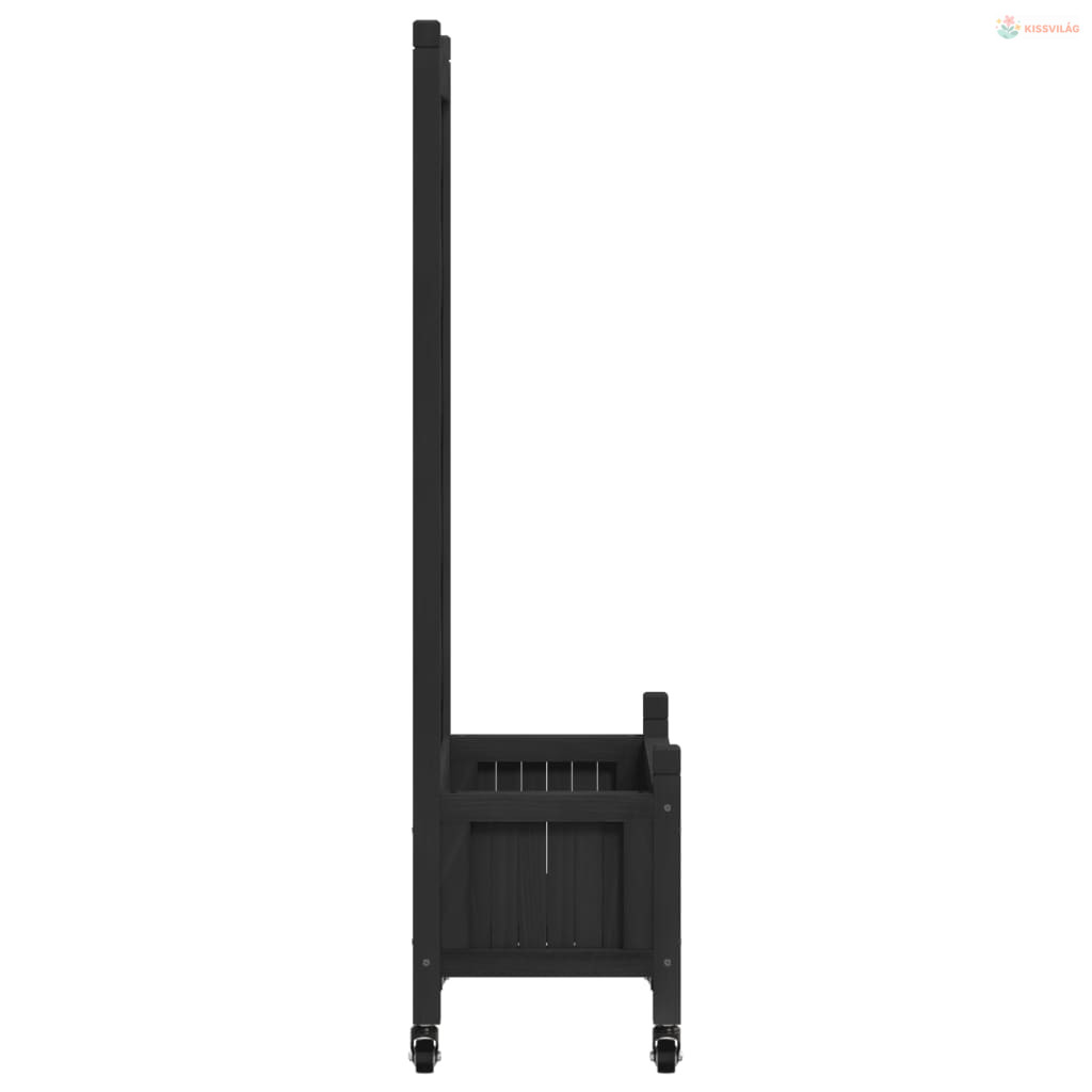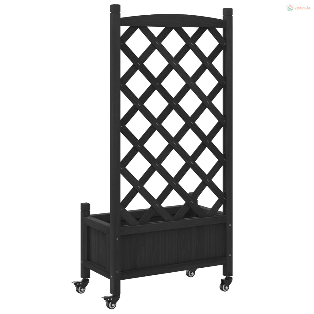 Fekete tömör fenyőfa rácsos virágláda kerekekkel